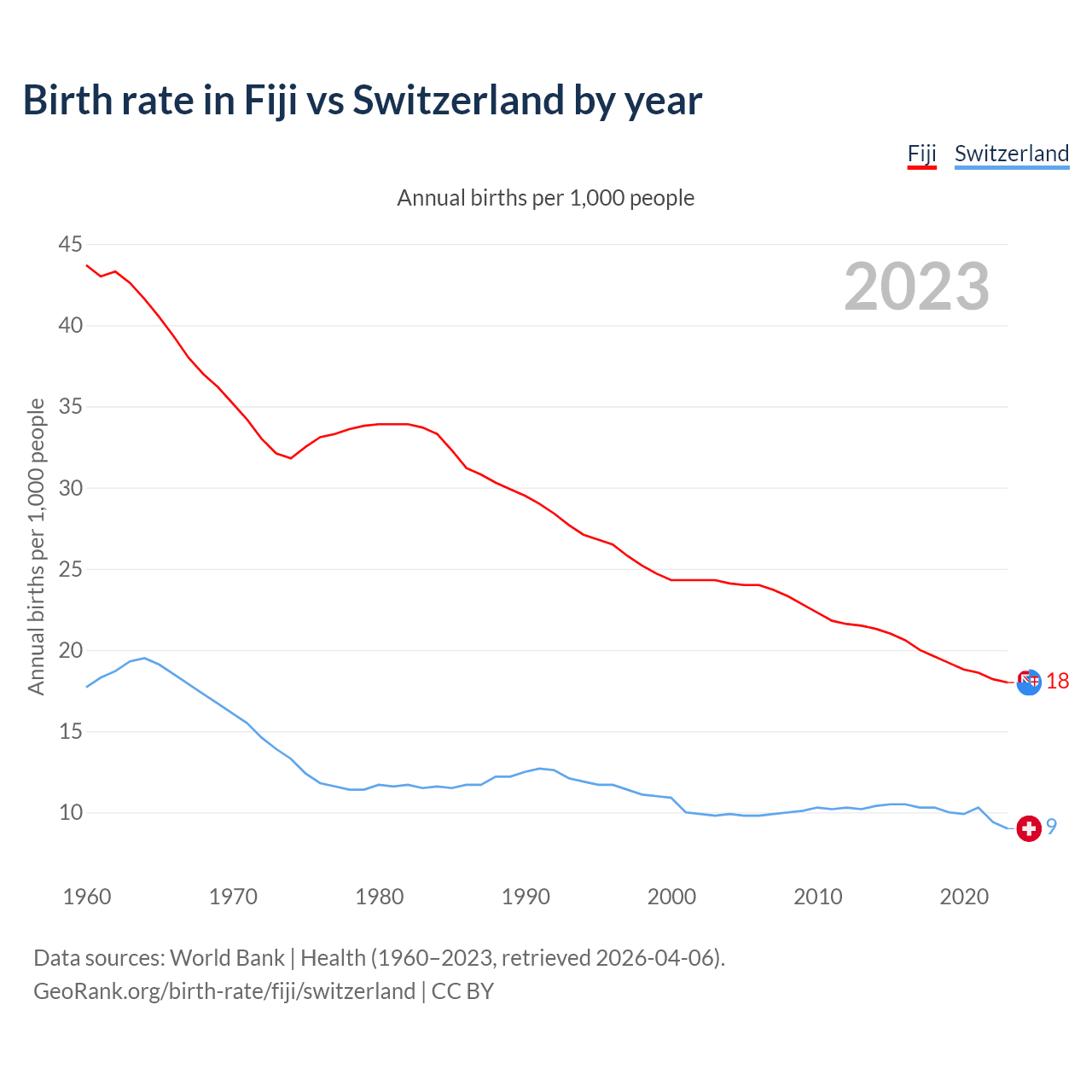 Fiji has an annual birth rate of 18 births per 1,000 people, compared to 9 for Switzerland. The average number of children a woman is expected to have during her lifetime — the fertility rate, is 2.28 in Fiji and 1.33 in Switzerland — 41.7% difference.