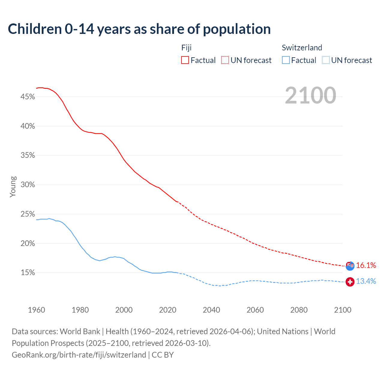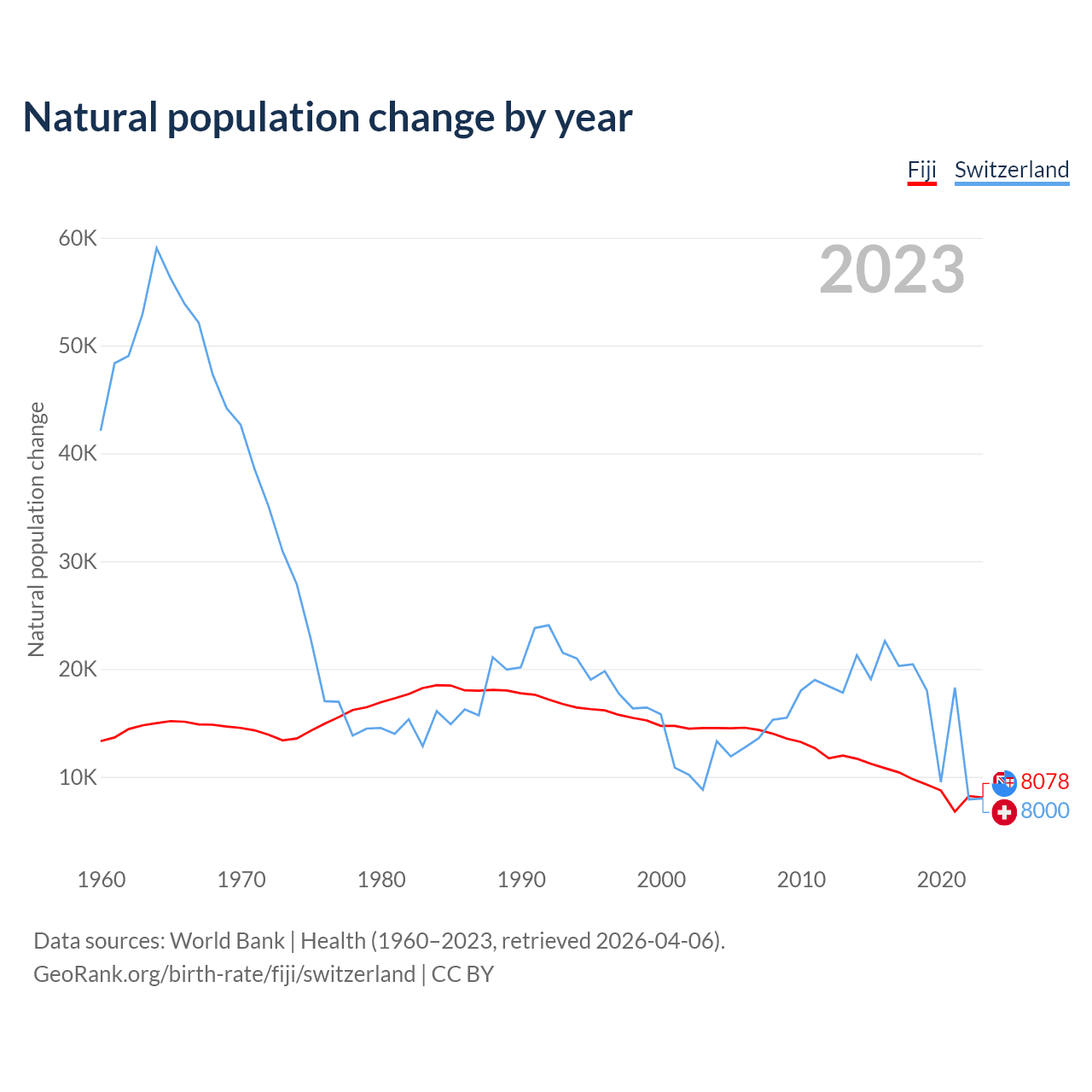 According to the latest available data on birth rates, the fertility rate in Fiji was 2.28 children per woman in 2023, compared to 1.33 in Switzerland in 2023. The replacement level is considered to be 2.1 children per woman.