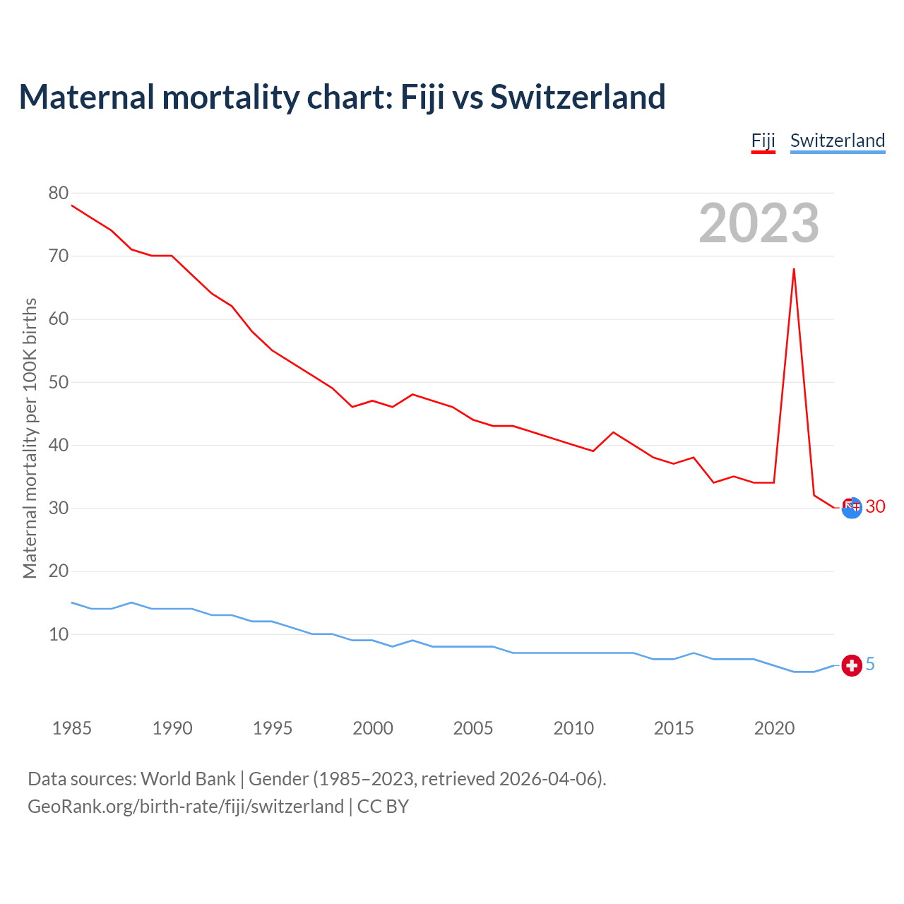 The maternal mortality rate, which is the probability of dying during childbirth or within 42 days of pregnancy termination, is 30 deaths per 100,000 live births in Fiji, compared to 5 deaths in Switzerland.