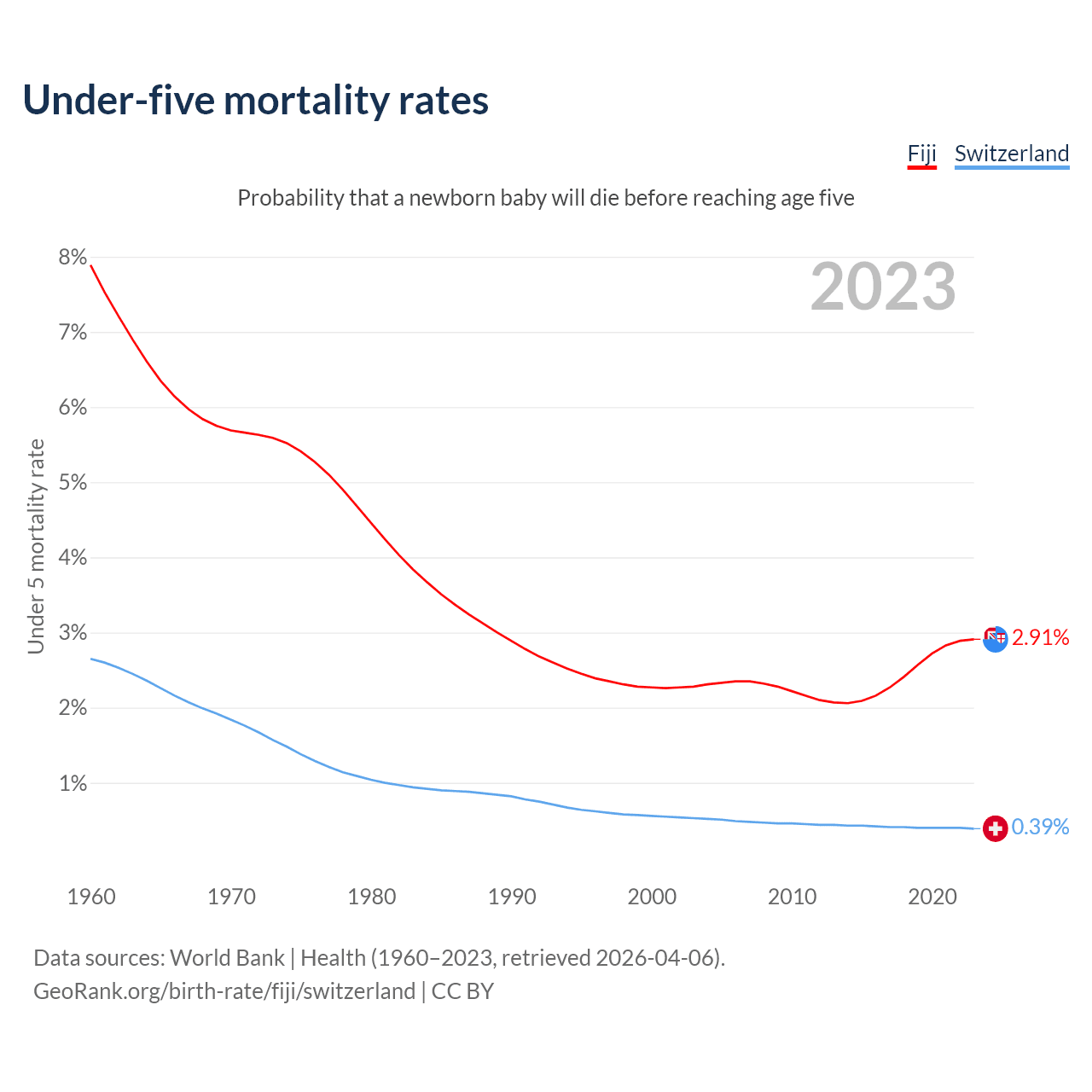 The chance that a newborn baby will die before reaching age five is 2.91% in Fiji and 0.39% in Switzerland. Above is a chart with historical data on under-five mortality rates.
