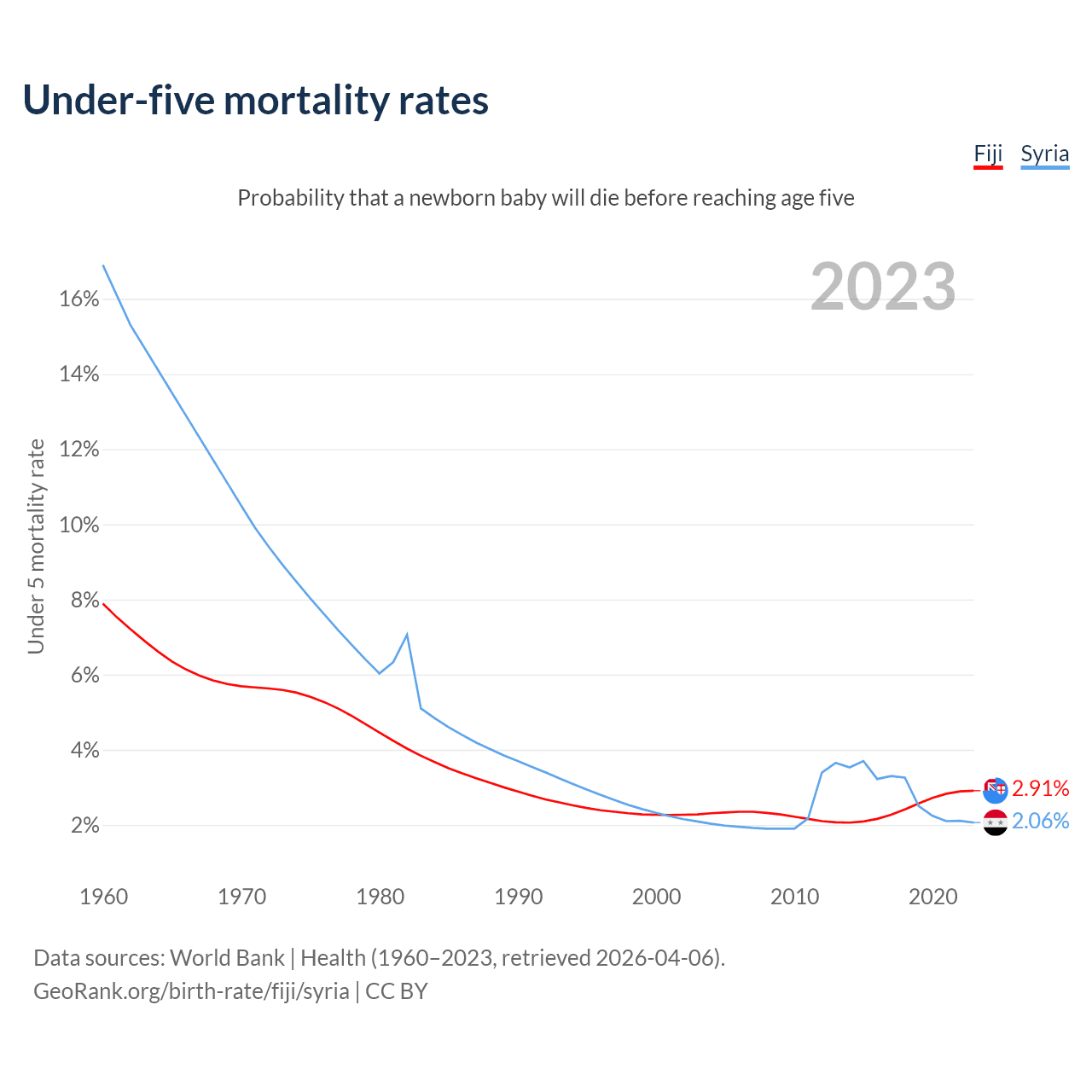 The chance that a newborn baby will die before reaching age five is 2.91% in Fiji and 2.06% in Syria. Above is a chart with historical data on under-five mortality rates.