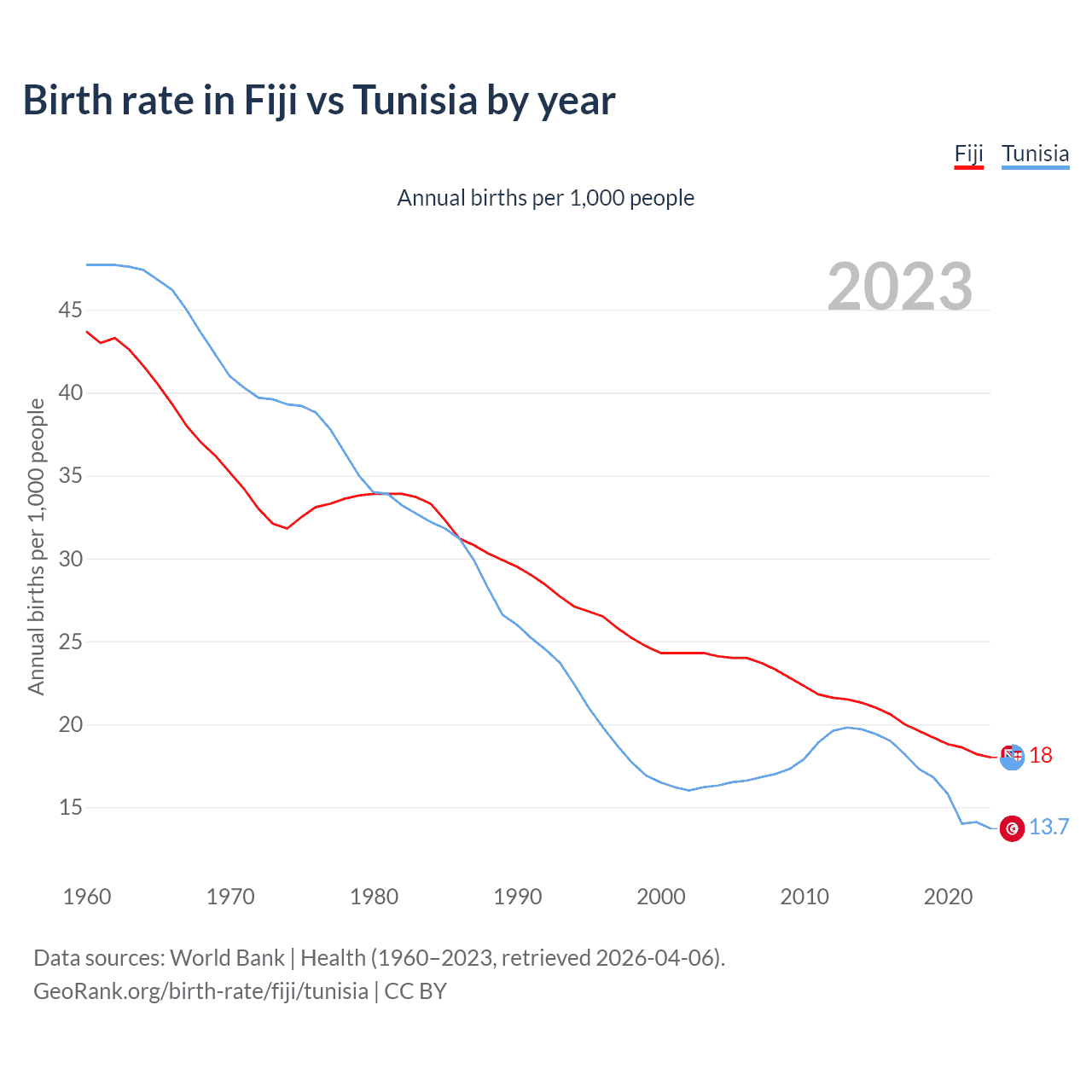 Fiji has an annual birth rate of 18 births per 1,000 people, compared to 13.7 for Tunisia. The average number of children a woman is expected to have during her lifetime — the fertility rate, is 2.28 in Fiji and 1.83 in Tunisia — 19.7% difference.