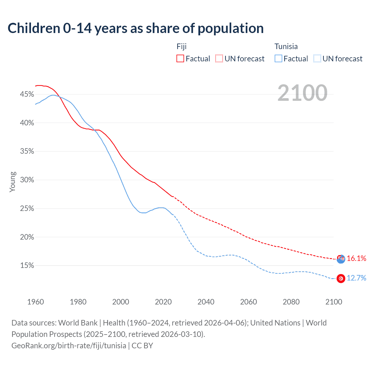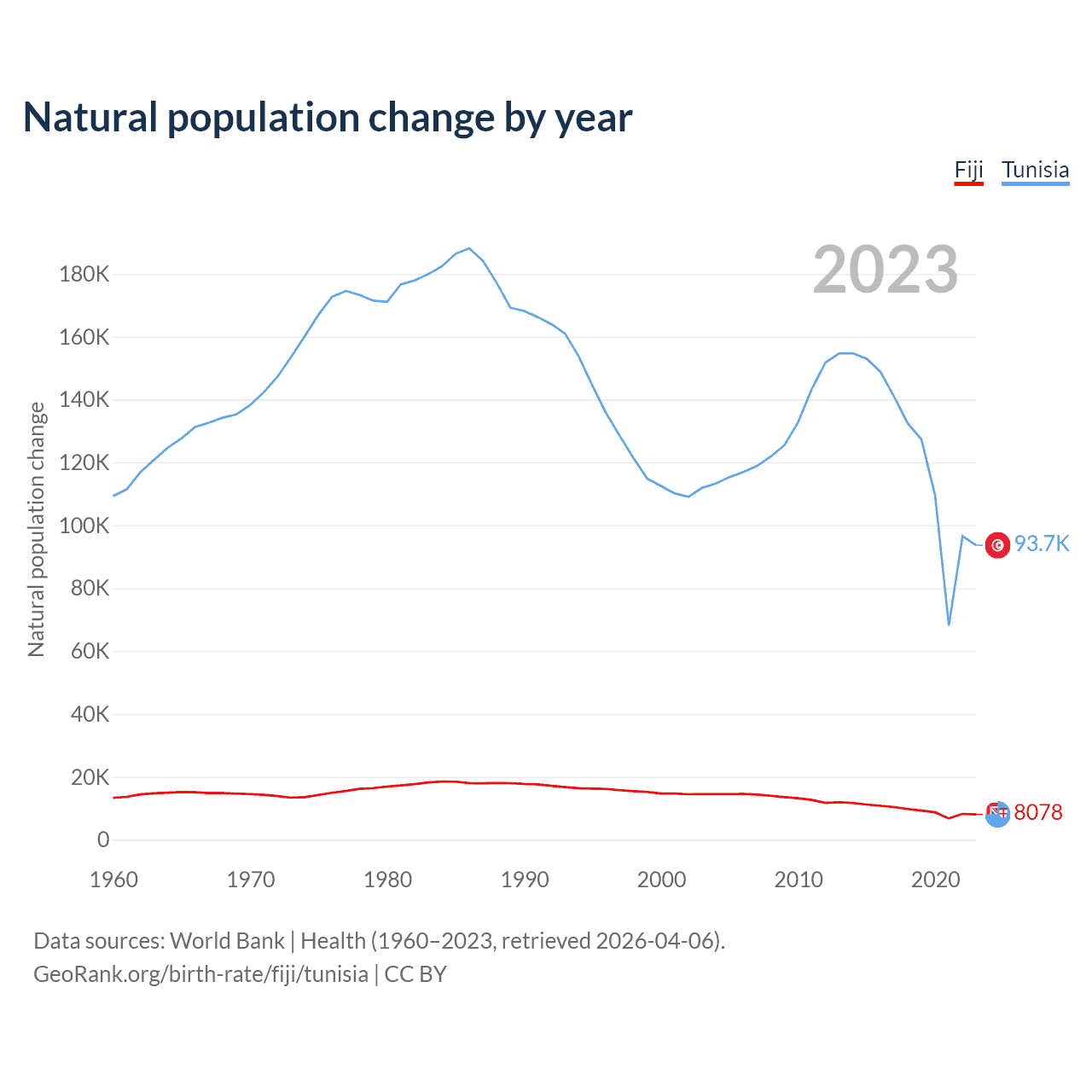 According to the latest available data on birth rates, the fertility rate in Fiji was 2.28 children per woman in 2023, compared to 1.83 in Tunisia in 2023. The replacement level is considered to be 2.1 children per woman.