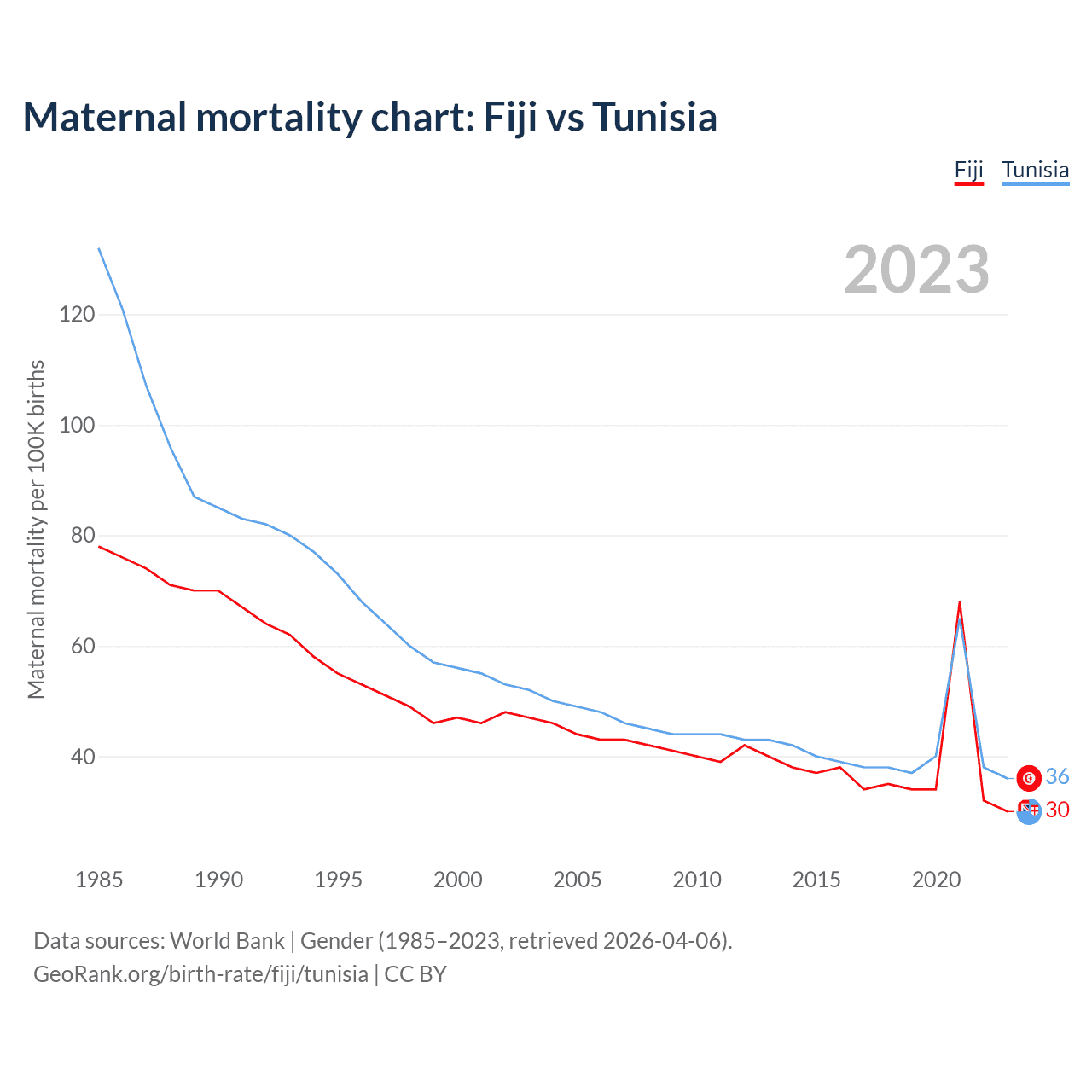 The maternal mortality rate, which is the probability of dying during childbirth or within 42 days of pregnancy termination, is 30 deaths per 100,000 live births in Fiji, compared to 36 deaths in Tunisia.