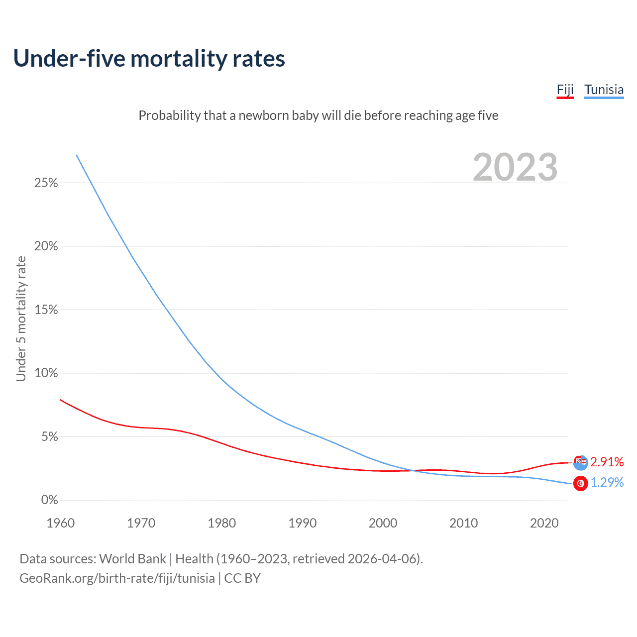 The chance that a newborn baby will die before reaching age five is 2.91% in Fiji and 1.29% in Tunisia. Above is a chart with historical data on under-five mortality rates.