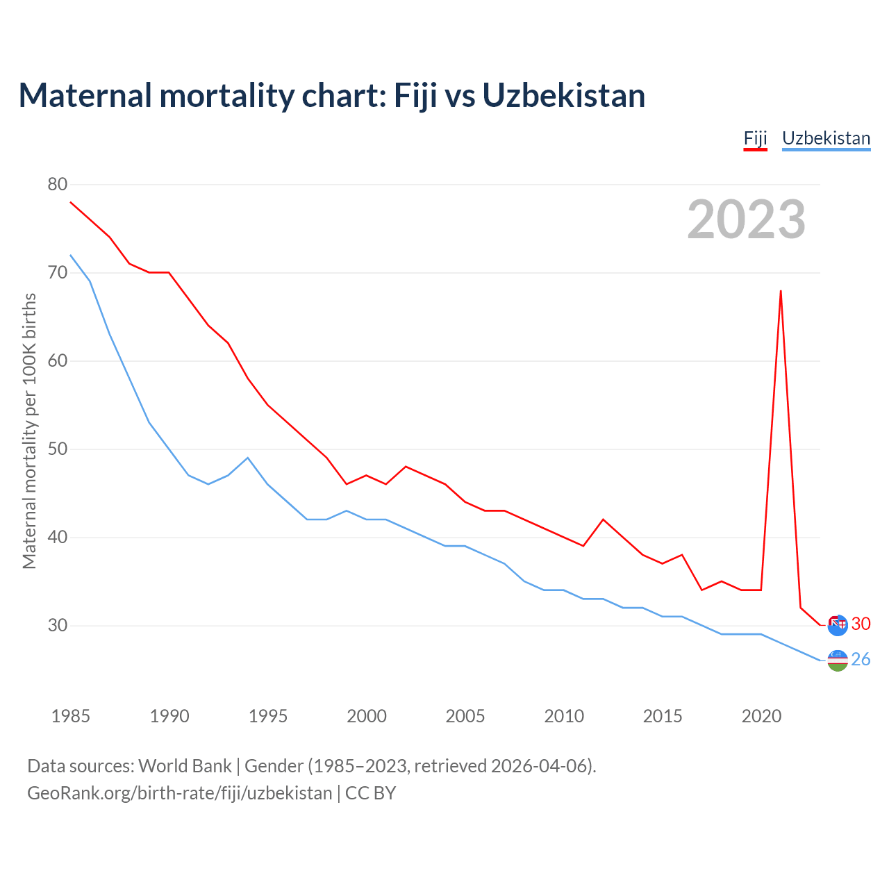 The maternal mortality rate, which is the probability of dying during childbirth or within 42 days of pregnancy termination, is 30 deaths per 100,000 live births in Fiji, compared to 26 deaths in Uzbekistan.