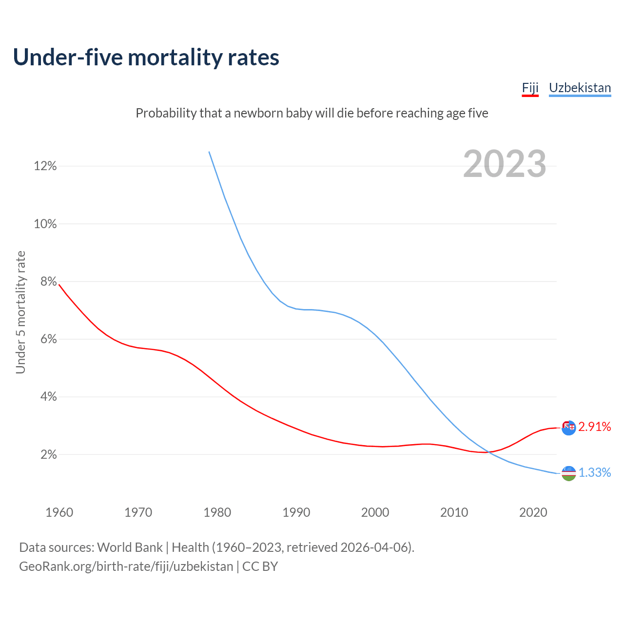 The chance that a newborn baby will die before reaching age five is 2.91% in Fiji and 1.33% in Uzbekistan. Above is a chart with historical data on under-five mortality rates.