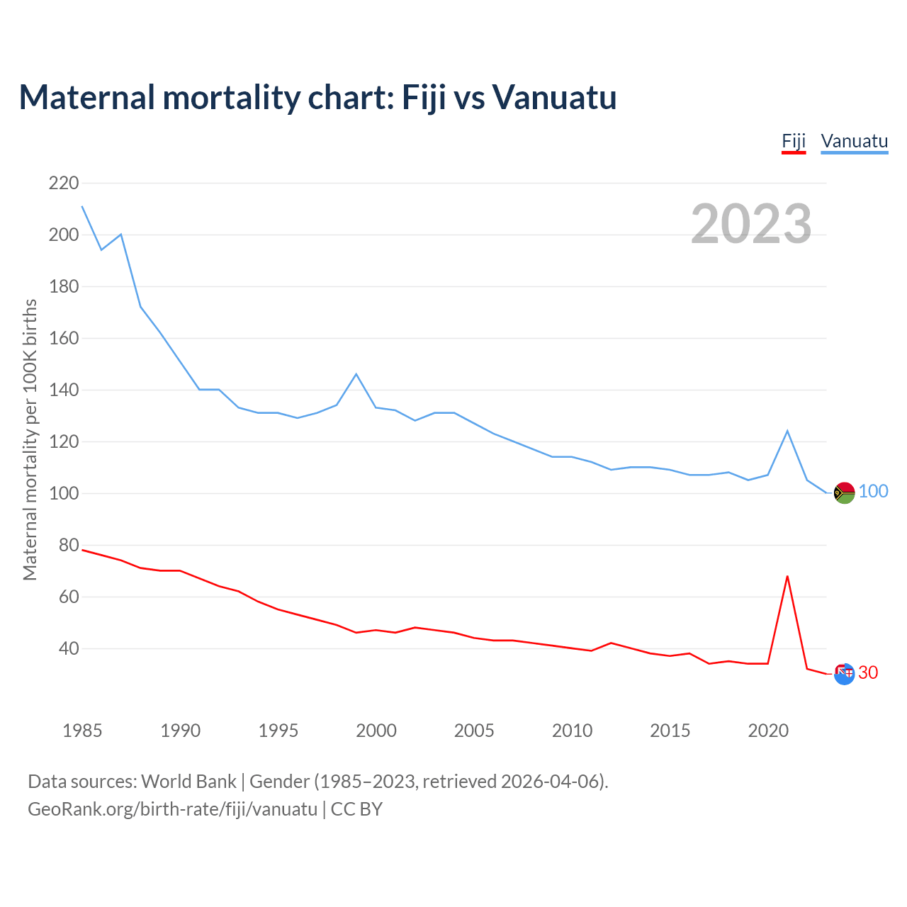 The maternal mortality rate, which is the probability of dying during childbirth or within 42 days of pregnancy termination, is 30 deaths per 100,000 live births in Fiji, compared to 100 deaths in Vanuatu.