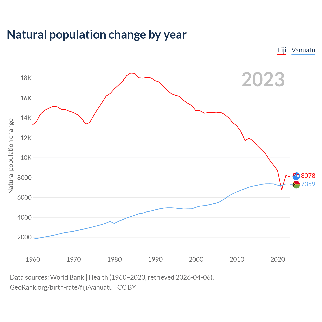According to the latest available data on birth rates, the fertility rate in Fiji was 2.28 children per woman in 2023, compared to 3.6 in Vanuatu in 2023. The replacement level is considered to be 2.1 children per woman.