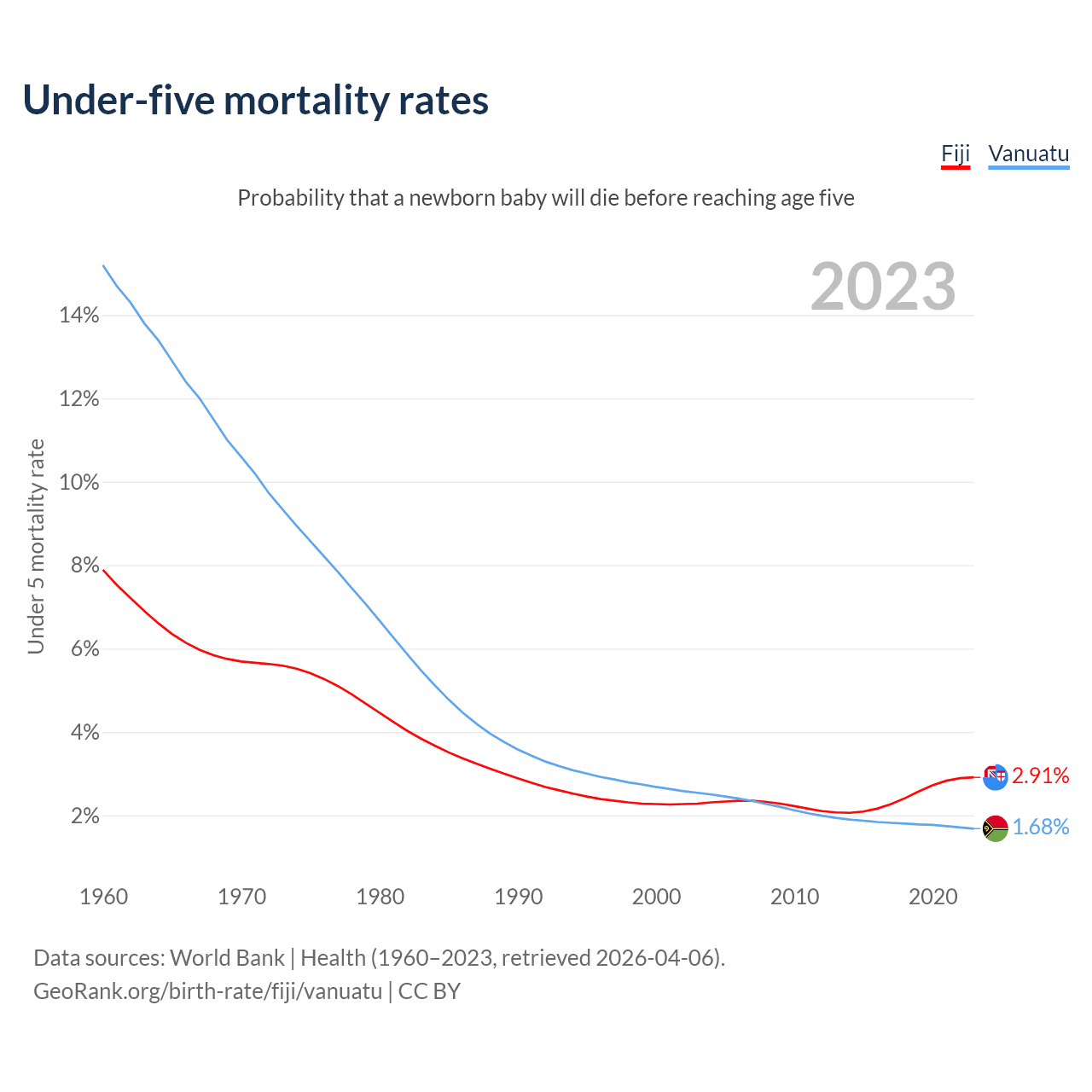 The chance that a newborn baby will die before reaching age five is 2.91% in Fiji and 1.68% in Vanuatu. Above is a chart with historical data on under-five mortality rates.