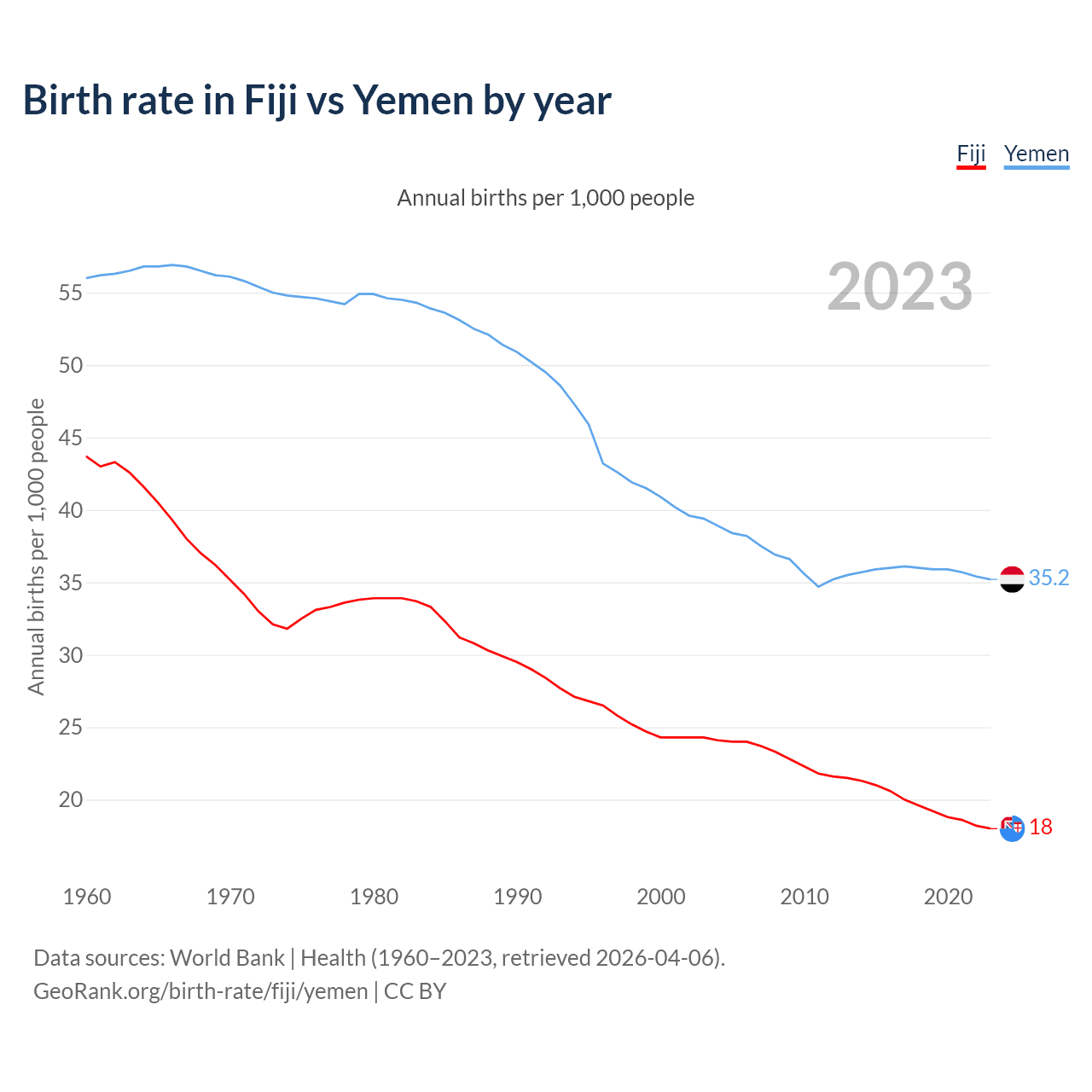 Fiji has an annual birth rate of 18 births per 1,000 people, compared to 35.2 for Yemen. The average number of children a woman is expected to have during her lifetime — the fertility rate, is 2.28 in Fiji and 4.59 in Yemen — 101.2% difference.