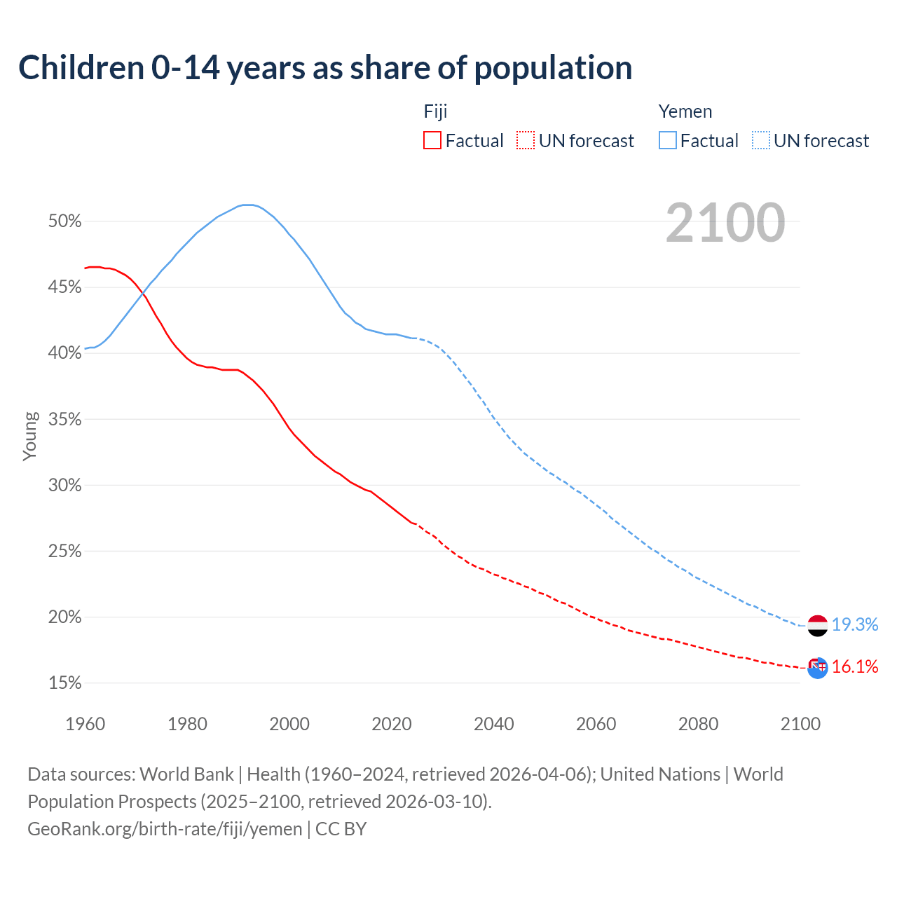 According to the latest available data on birth rates, the fertility rate in Fiji was 2.28 children per woman in 2023, compared to 4.59 in Yemen in 2023. The replacement level is considered to be 2.1 children per woman.