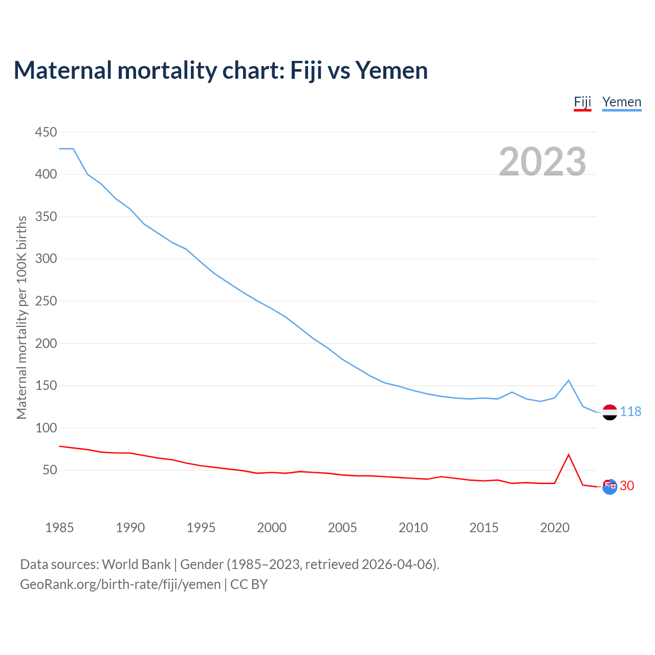 The maternal mortality rate, which is the probability of dying during childbirth or within 42 days of pregnancy termination, is 30 deaths per 100,000 live births in Fiji, compared to 118 deaths in Yemen.