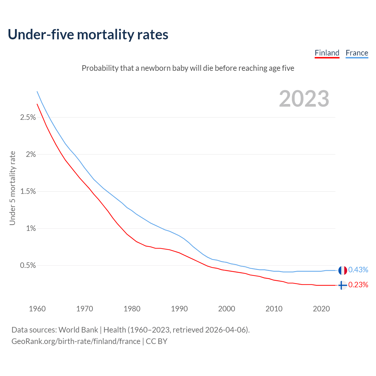 The chance that a newborn baby will die before reaching age five is 0.23% in Finland and 0.43% in France. Above is a chart with historical data on under-five mortality rates.