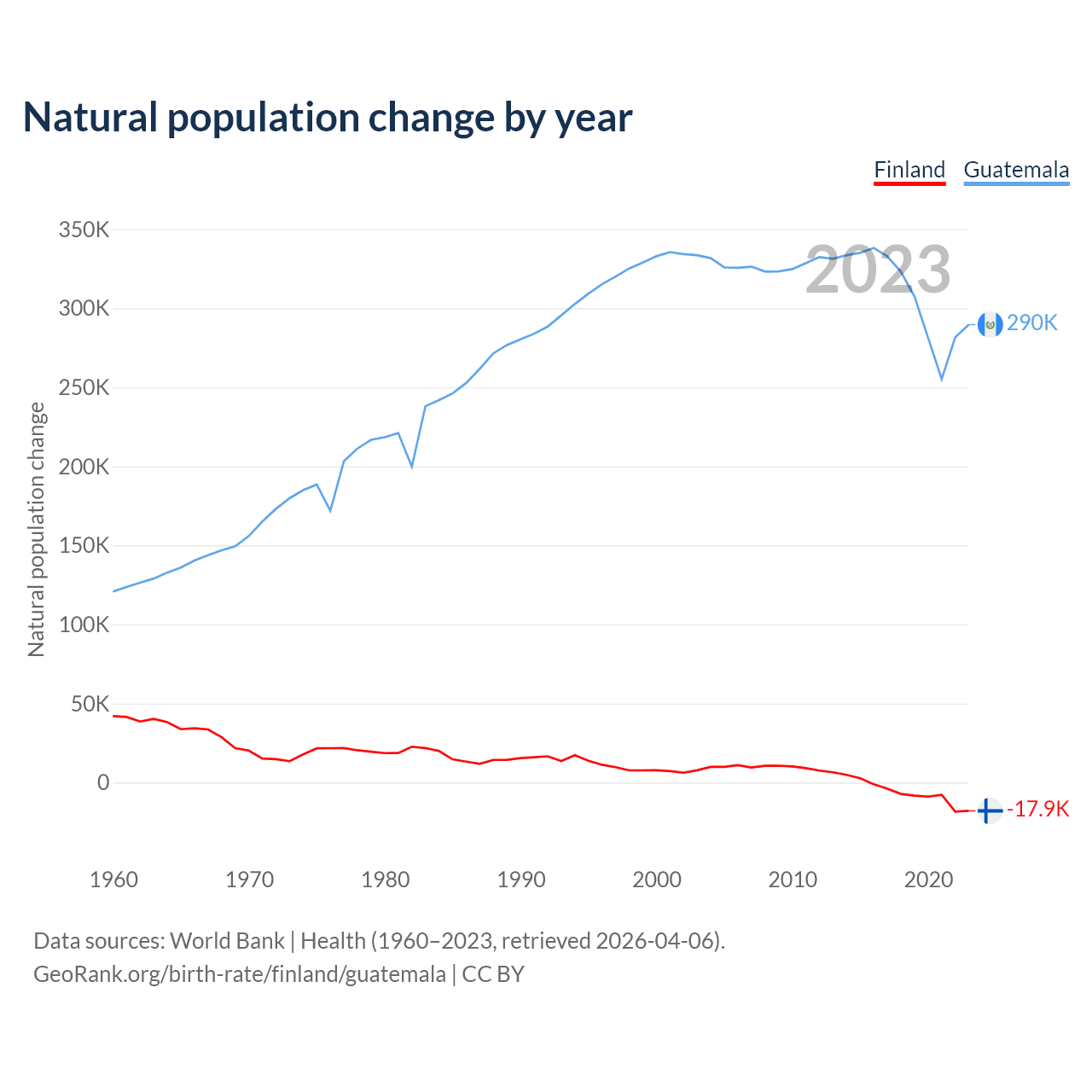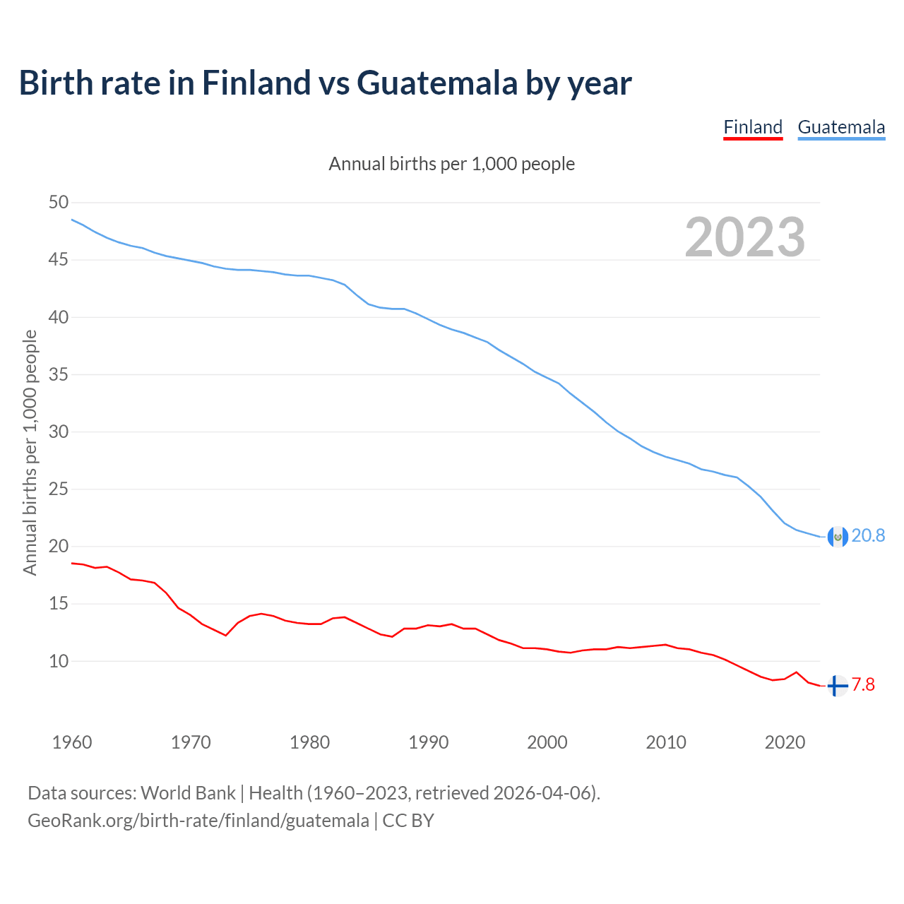 Finland has an annual birth rate of 7.8 births per 1,000 people, compared to 20.8 for Guatemala. The average number of children a woman is expected to have during her lifetime — the fertility rate, is 1.26 in Finland and 2.31 in Guatemala — 83.4% difference.