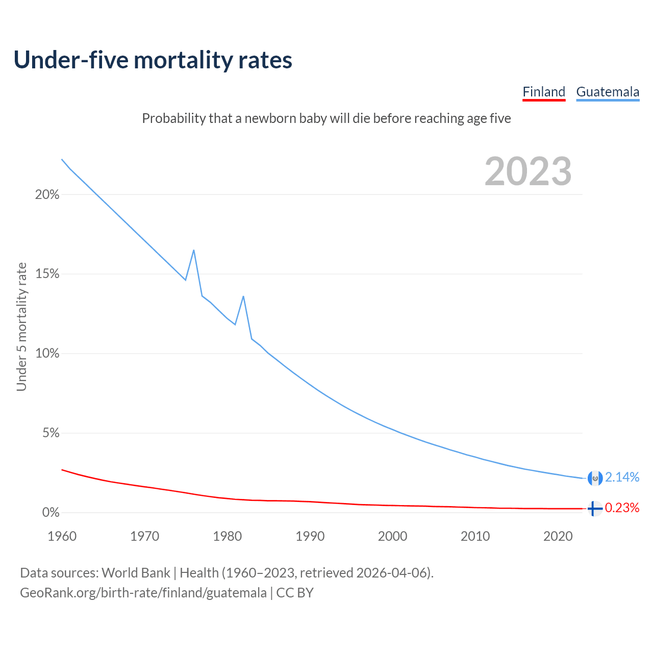 The chance that a newborn baby will die before reaching age five is 0.23% in Finland and 2.14% in Guatemala. Above is a chart with historical data on under-five mortality rates.