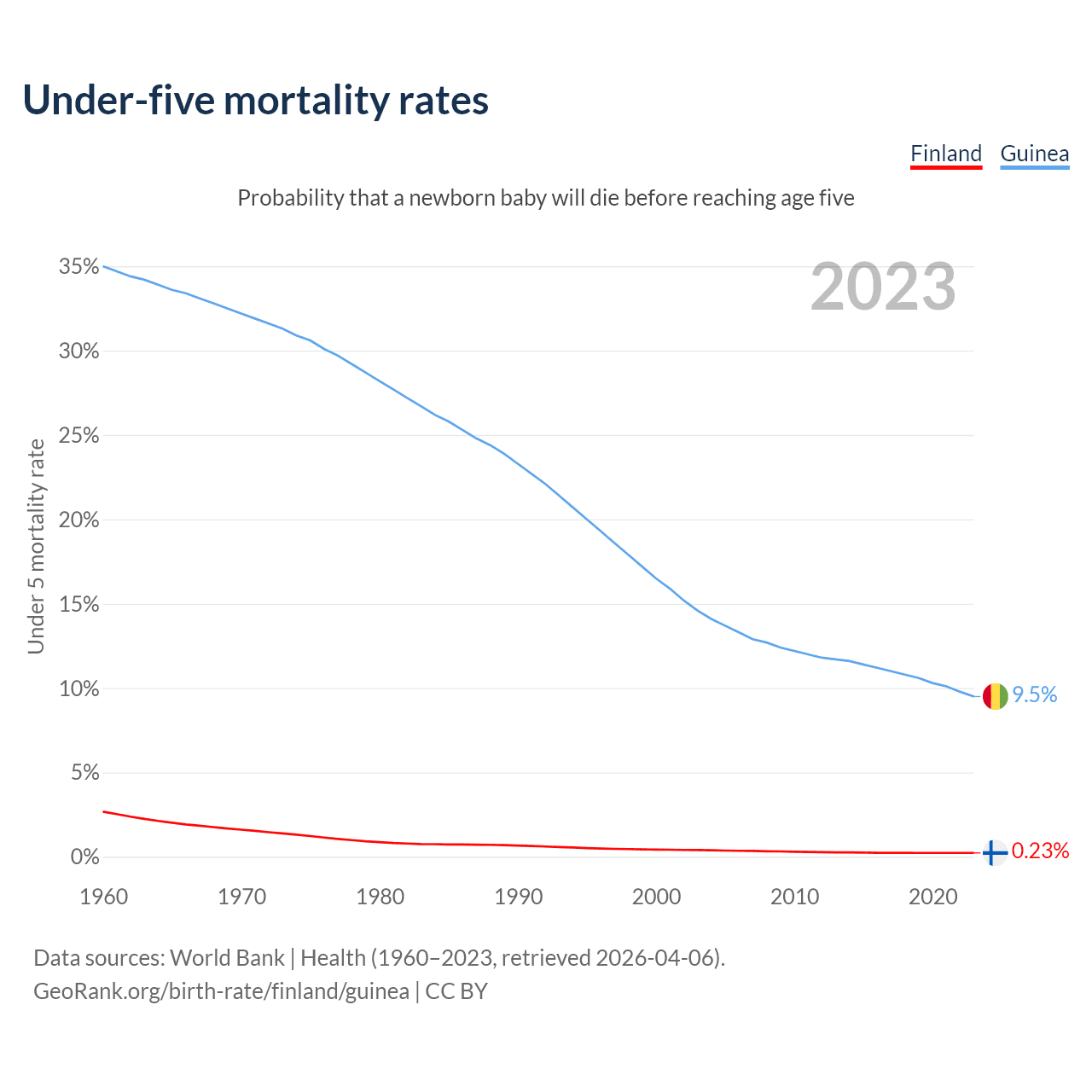 The chance that a newborn baby will die before reaching age five is 0.23% in Finland and 9.5% in Guinea. Above is a chart with historical data on under-five mortality rates.