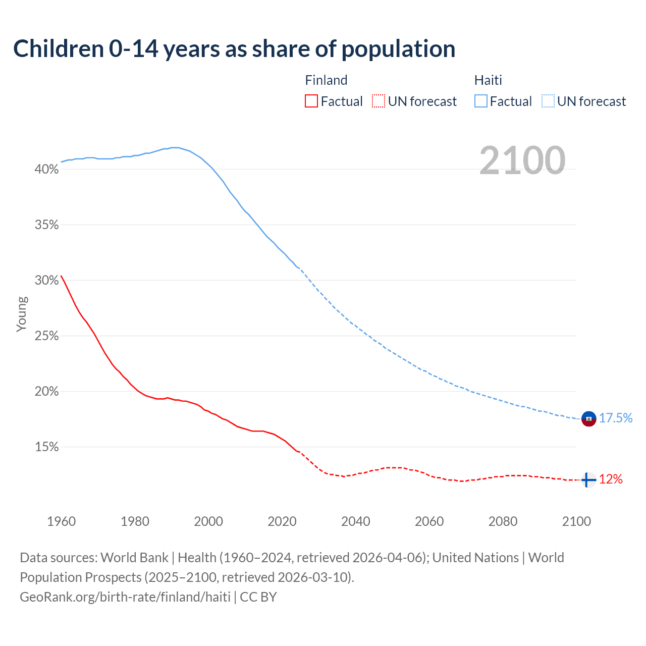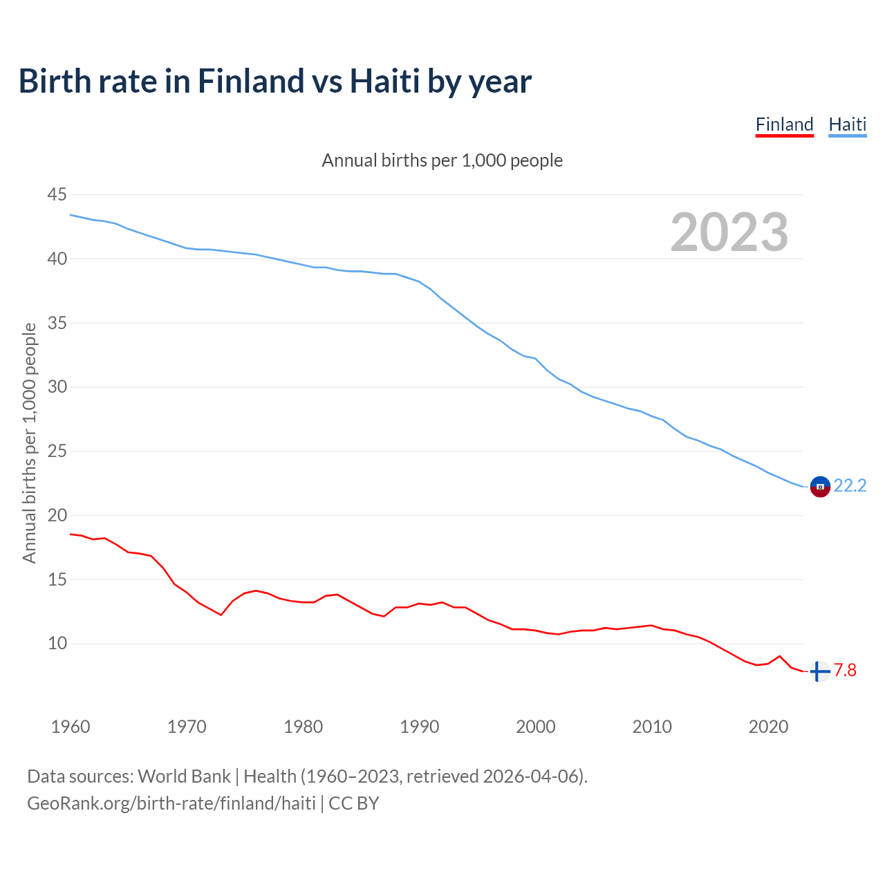 According to the latest available data on birth rates, the fertility rate in Finland was 1.26 children per woman in 2023, compared to 2.66 in Haiti in 2023. The replacement level is considered to be 2.1 children per woman.