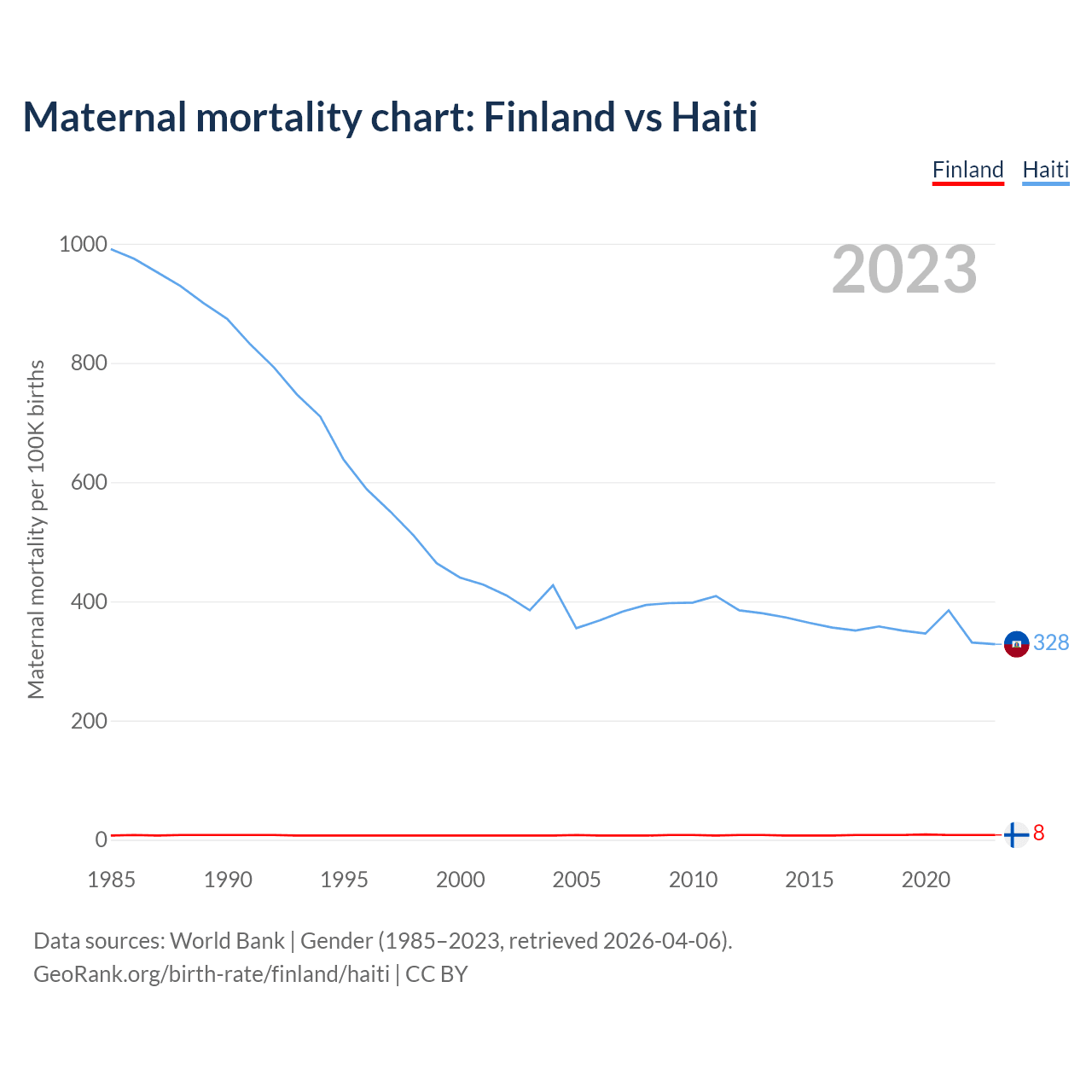 The maternal mortality rate, which is the probability of dying during childbirth or within 42 days of pregnancy termination, is 8 deaths per 100,000 live births in Finland, compared to 328 deaths in Haiti.