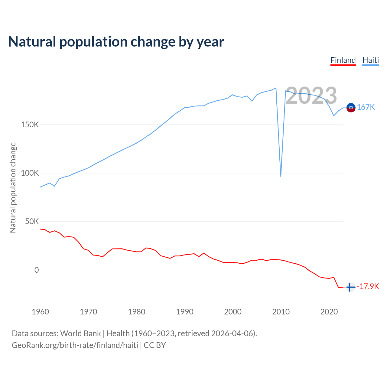 Finland has an annual birth rate of 7.8 births per 1,000 people, compared to 22.2 for Haiti. The average number of children a woman is expected to have during her lifetime — the fertility rate, is 1.26 in Finland and 2.66 in Haiti — 110.8% difference.