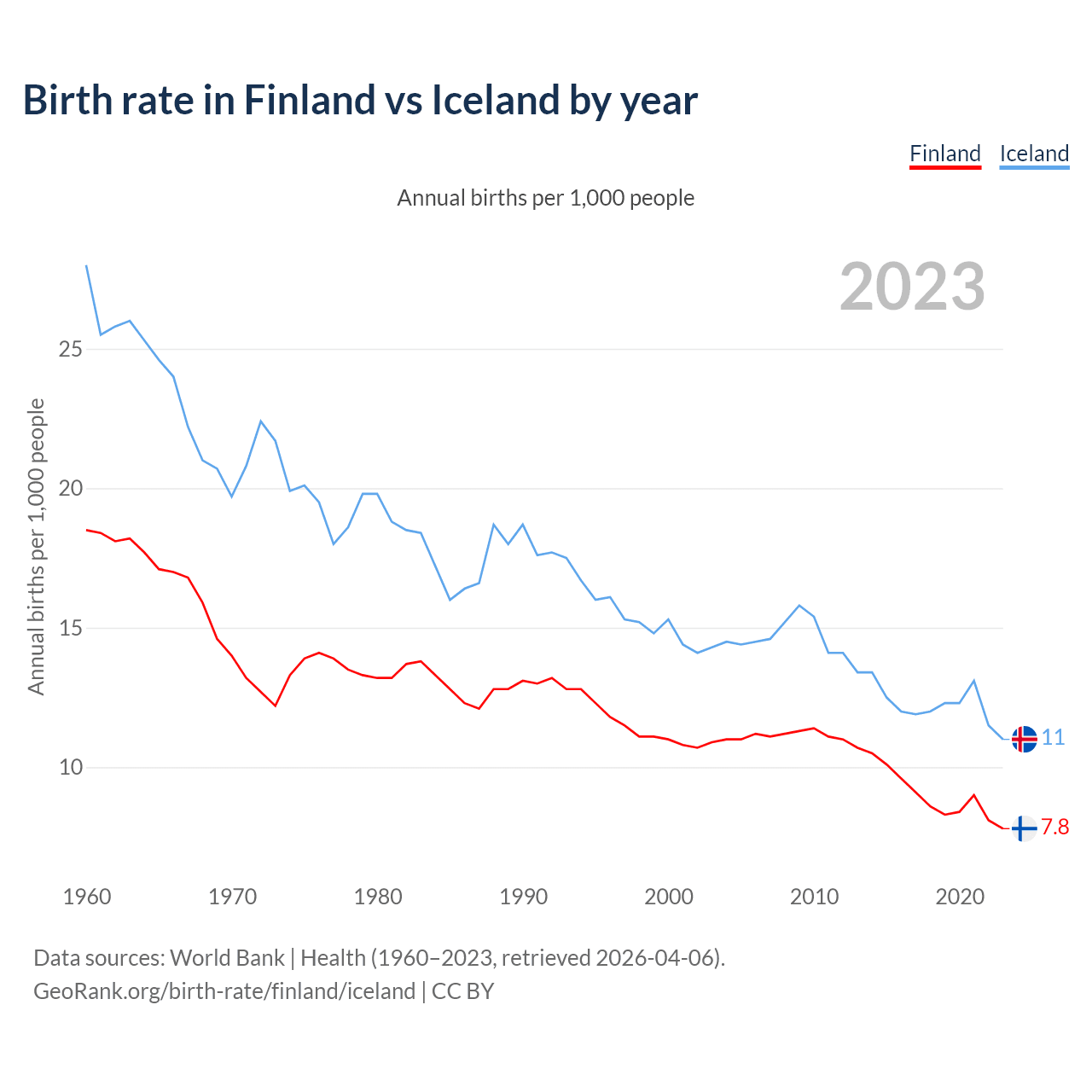 Finland has an annual birth rate of 7.8 births per 1,000 people, compared to 11 for Iceland. The average number of children a woman is expected to have during her lifetime — the fertility rate, is 1.26 in Finland and 1.59 in Iceland — 26.2% difference.