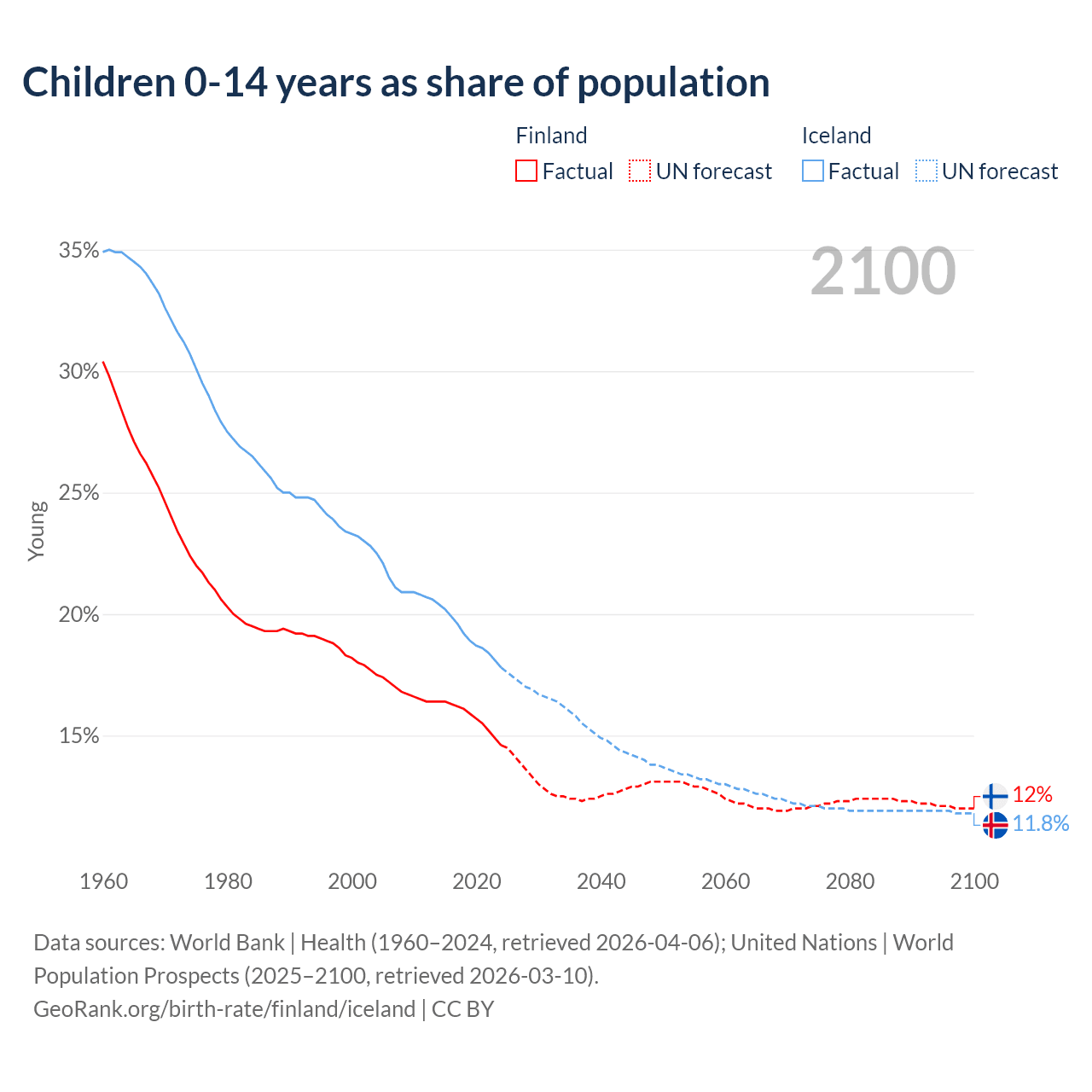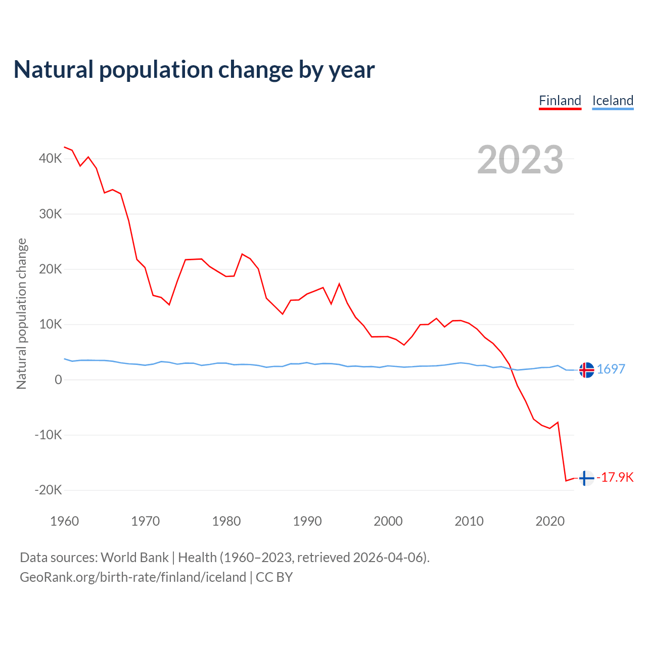 According to the latest available data on birth rates, the fertility rate in Finland was 1.26 children per woman in 2023, compared to 1.59 in Iceland in 2023. The replacement level is considered to be 2.1 children per woman.