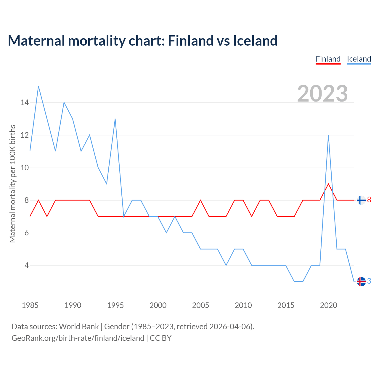 The maternal mortality rate, which is the probability of dying during childbirth or within 42 days of pregnancy termination, is 8 deaths per 100,000 live births in Finland, compared to 3 deaths in Iceland.