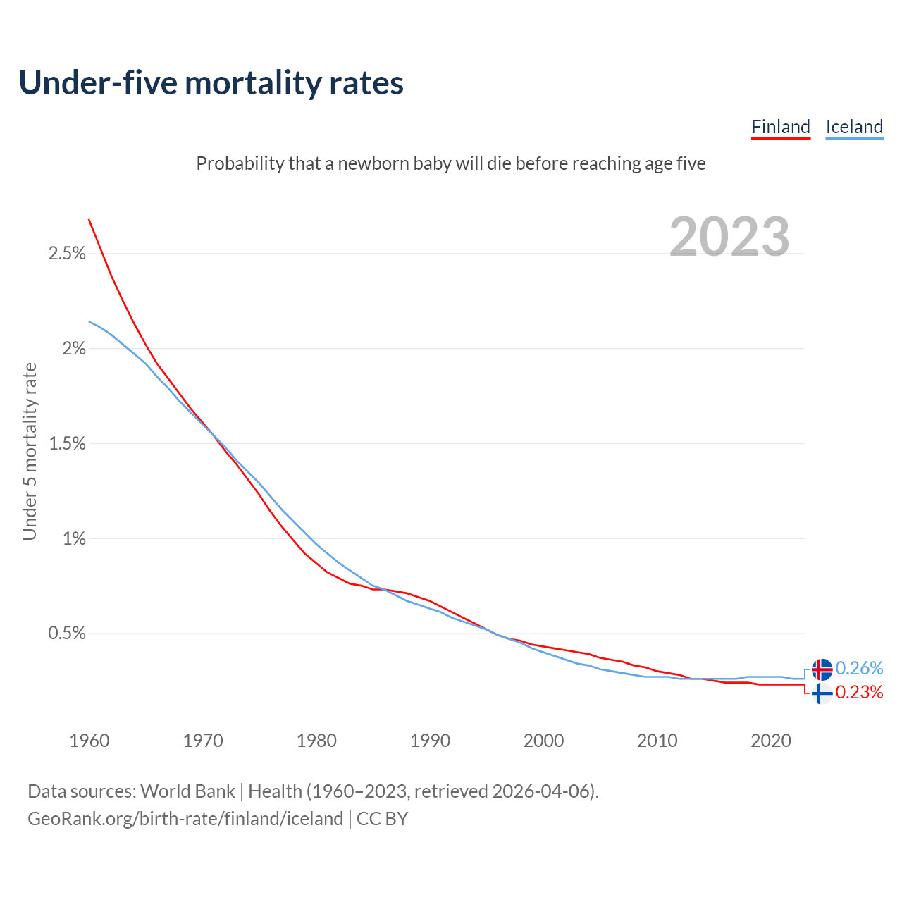 The chance that a newborn baby will die before reaching age five is 0.23% in Finland and 0.26% in Iceland. Above is a chart with historical data on under-five mortality rates.