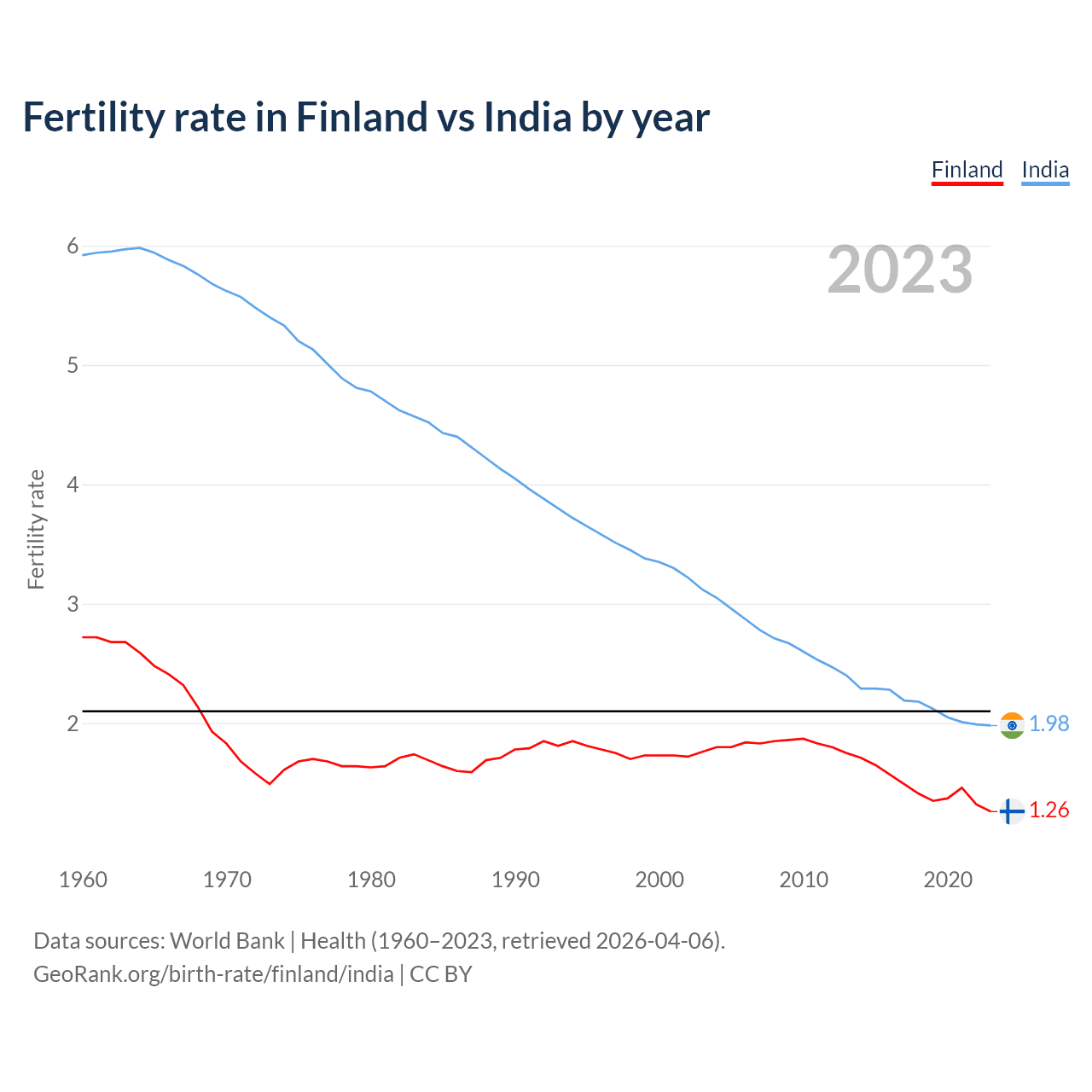 1960 vs 2023, the fertility rate has decreased by 53.7% in Finland and by 66.6% in India — in 1960, it was 2.72 and 5.92, respectively.