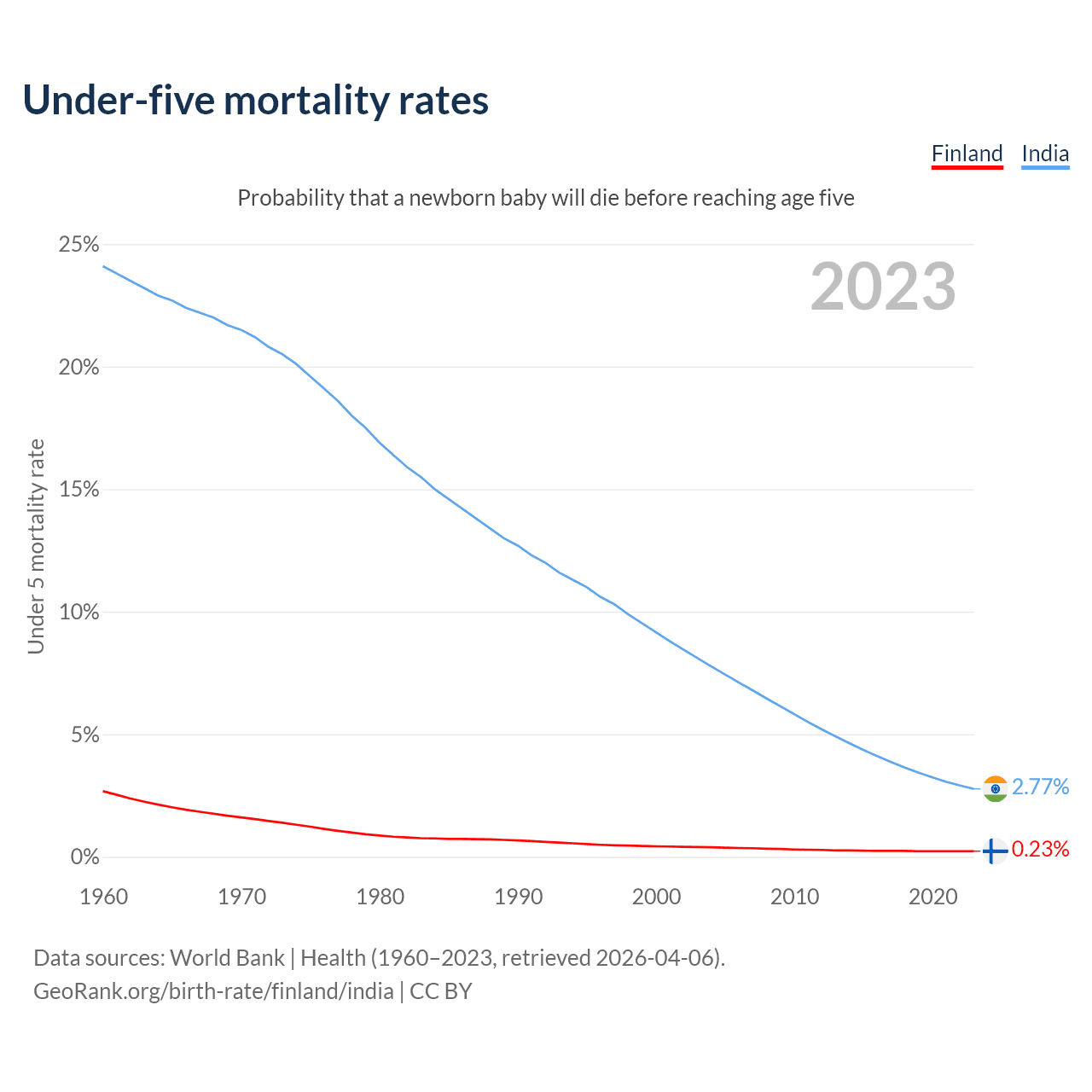 The chance that a newborn baby will die before reaching age five is 0.23% in Finland and 2.77% in India. Above is a chart with historical data on under-five mortality rates.