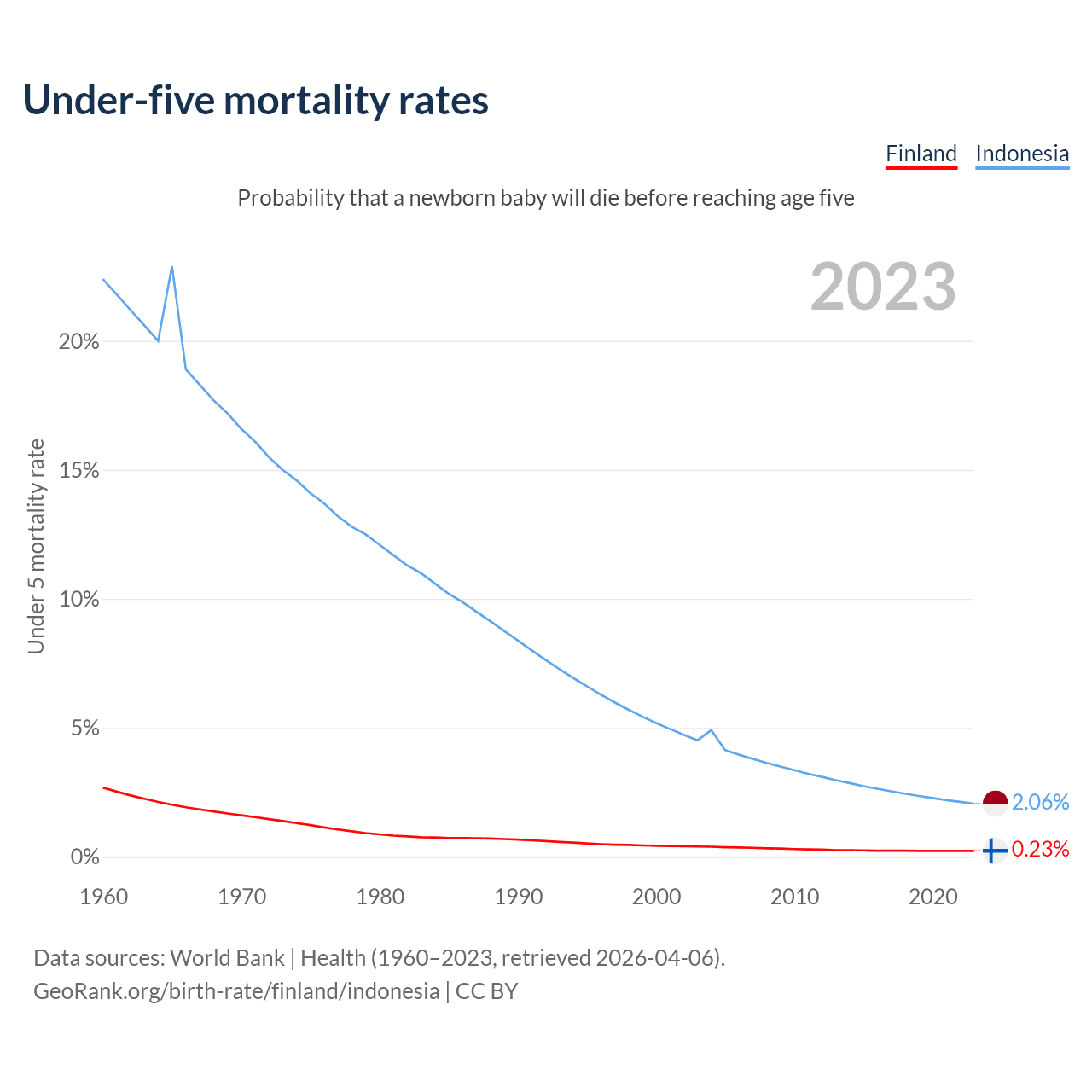 The chance that a newborn baby will die before reaching age five is 0.23% in Finland and 2.06% in Indonesia. Above is a chart with historical data on under-five mortality rates.