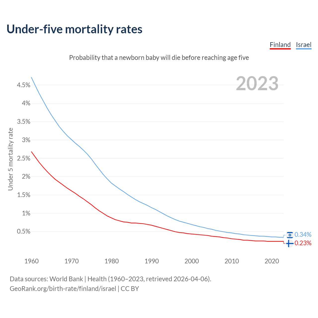 The chance that a newborn baby will die before reaching age five is 0.23% in Finland and 0.34% in Israel. Above is a chart with historical data on under-five mortality rates.