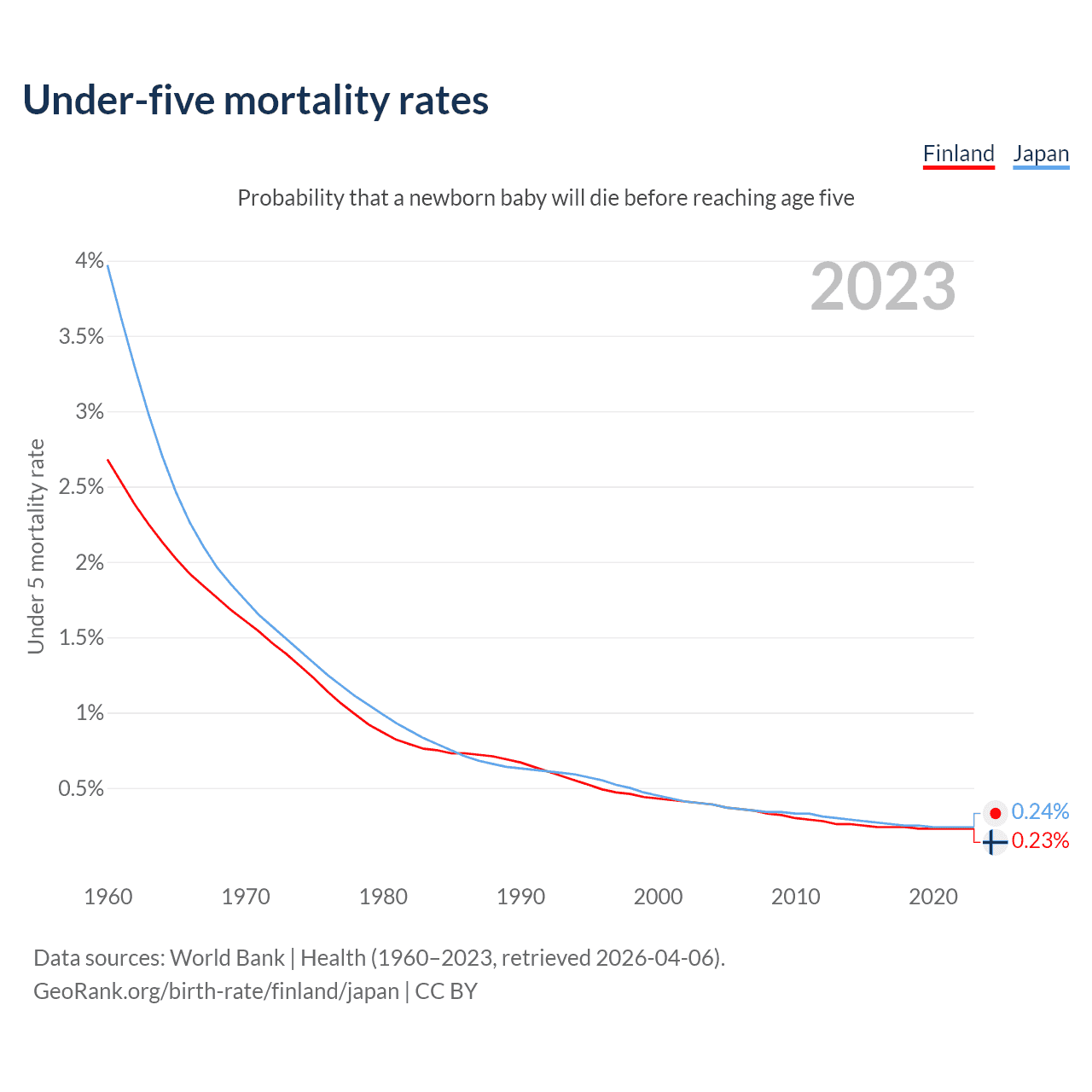 The chance that a newborn baby will die before reaching age five is 0.23% in Finland and 0.24% in Japan. Above is a chart with historical data on under-five mortality rates.