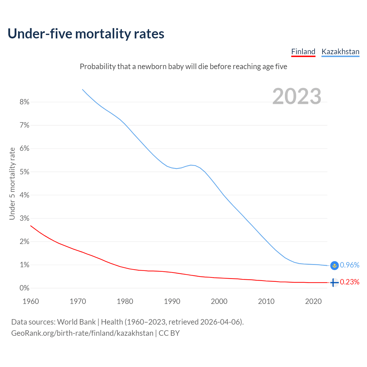 The chance that a newborn baby will die before reaching age five is 0.23% in Finland and 0.96% in Kazakhstan. Above is a chart with historical data on under-five mortality rates.
