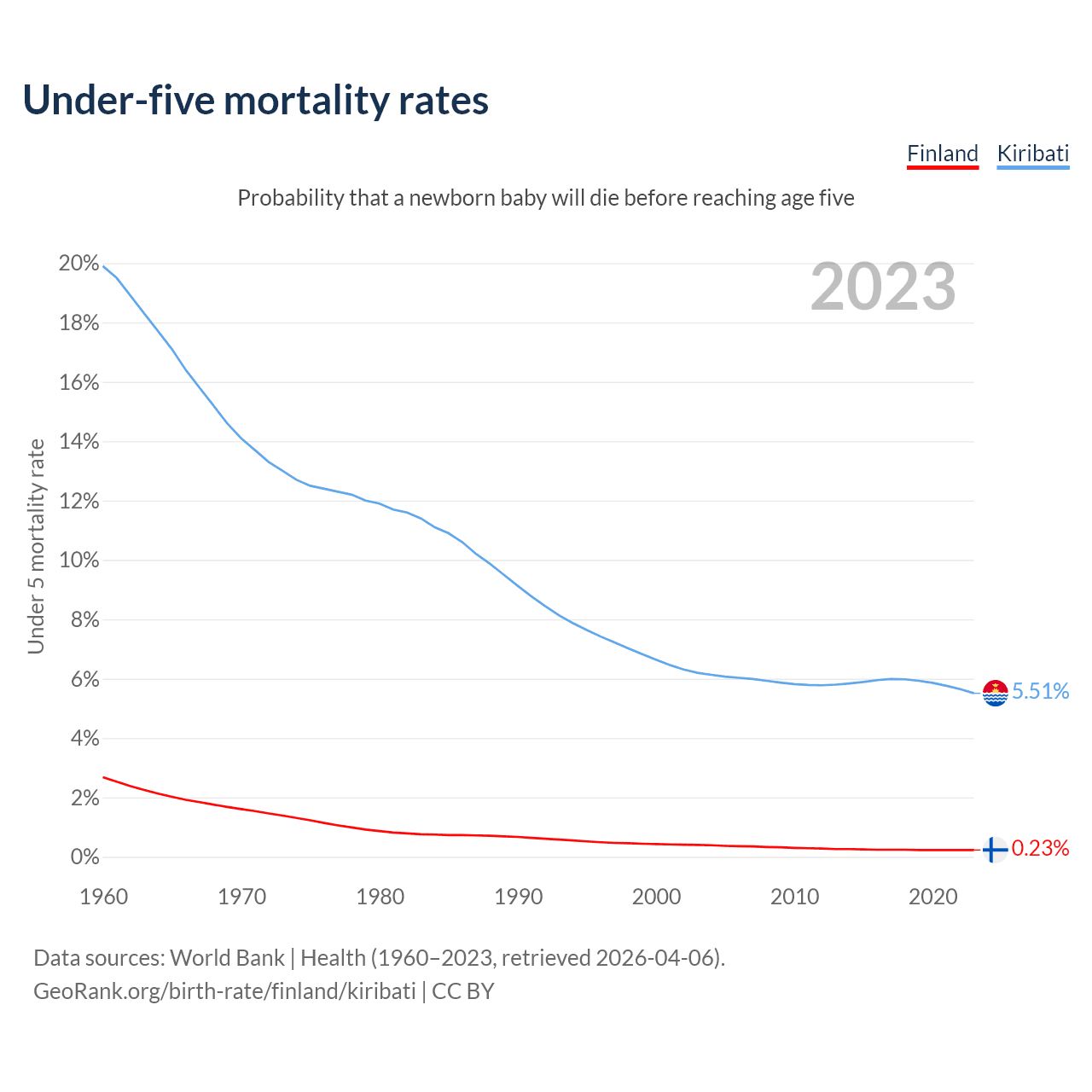 The chance that a newborn baby will die before reaching age five is 0.23% in Finland and 5.51% in Kiribati. Above is a chart with historical data on under-five mortality rates.