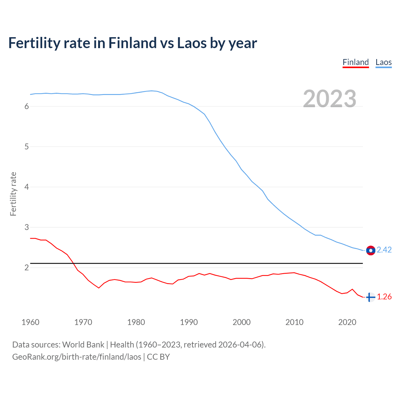 According to the latest available data on birth rates, the fertility rate in Finland was 1.26 children per woman in 2023, compared to 2.42 in Laos in 2023. The replacement level is considered to be 2.1 children per woman.