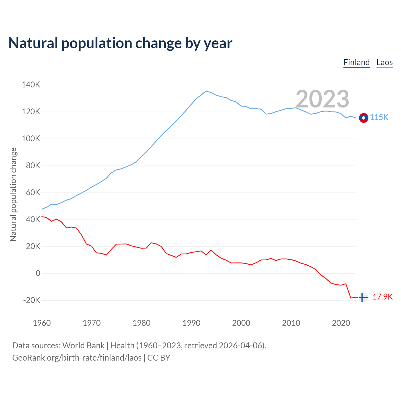 Finland has an annual birth rate of 7.8 births per 1,000 people, compared to 21.3 for Laos. The average number of children a woman is expected to have during her lifetime — the fertility rate, is 1.26 in Finland and 2.42 in Laos — 92.1% difference.