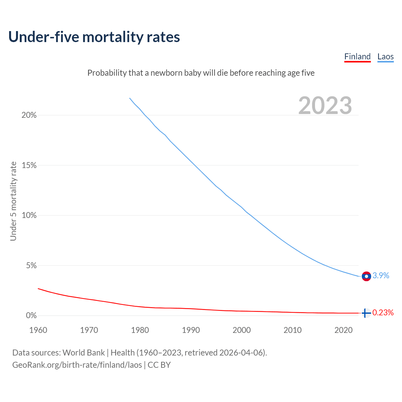 The chance that a newborn baby will die before reaching age five is 0.23% in Finland and 3.9% in Laos. Above is a chart with historical data on under-five mortality rates.