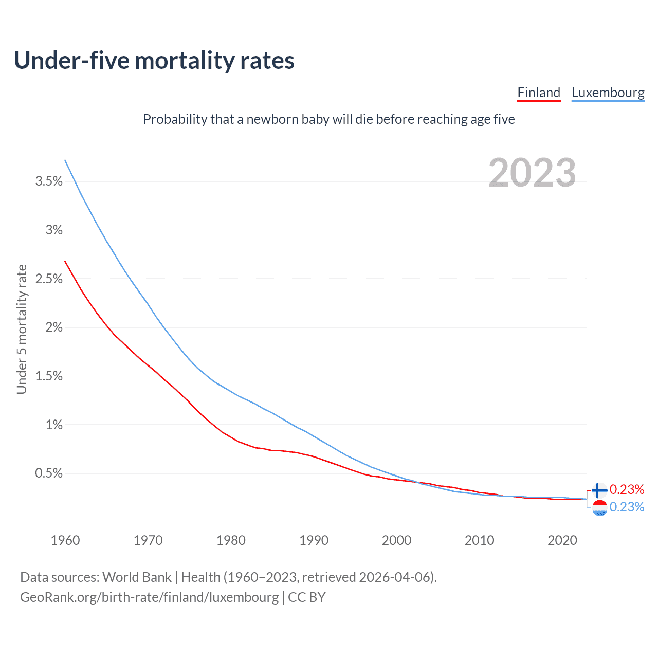 The chance that a newborn baby will die before reaching age five is 0.23% in Finland and 0.23% in Luxembourg. Above is a chart with historical data on under-five mortality rates.
