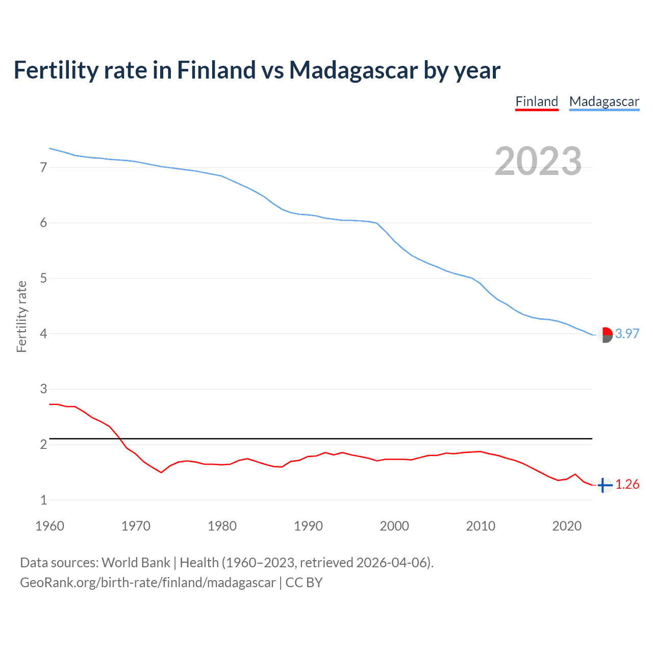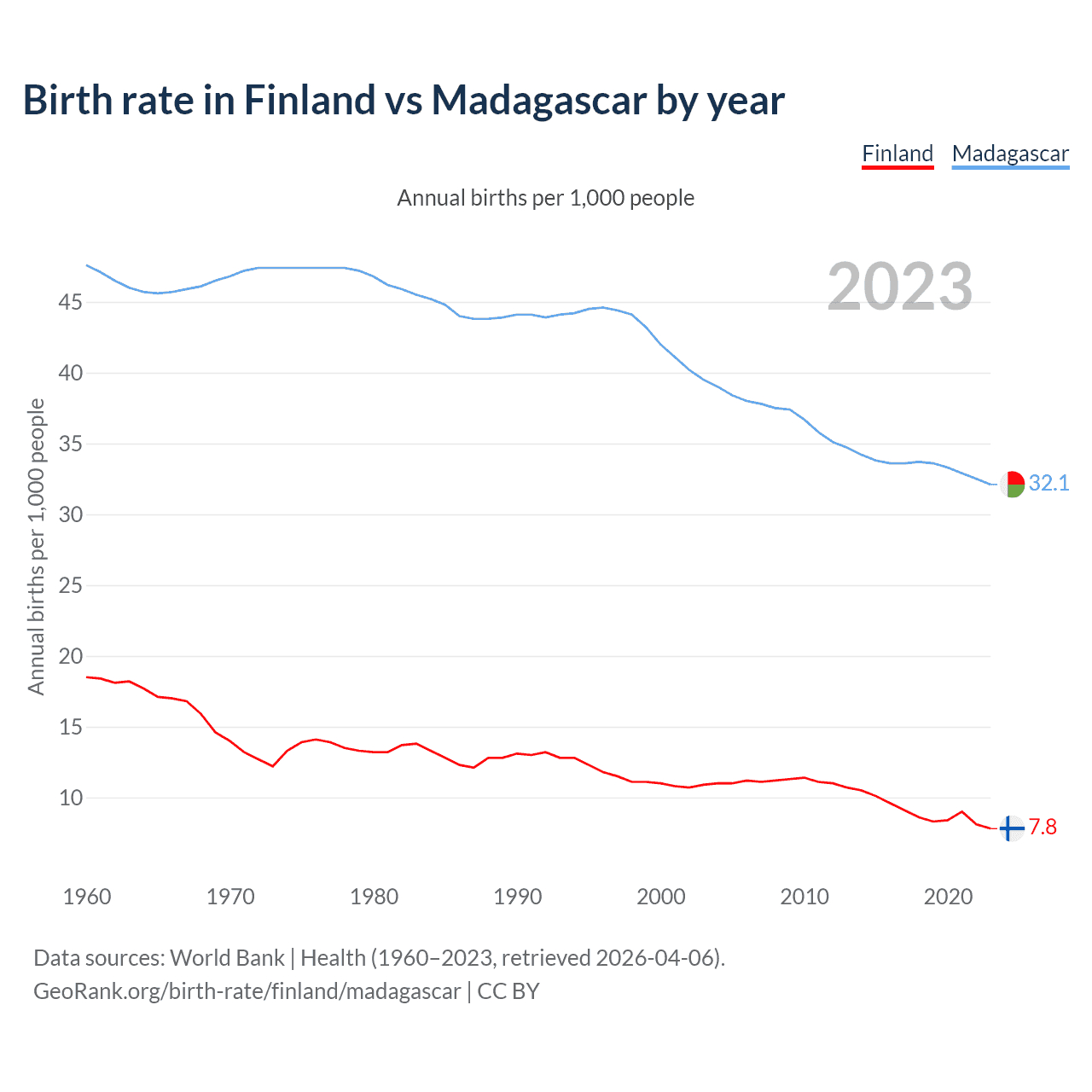 Finland has an annual birth rate of 7.8 births per 1,000 people, compared to 32.1 for Madagascar. The average number of children a woman is expected to have during her lifetime — the fertility rate, is 1.26 in Finland and 3.97 in Madagascar — 215.2% difference.