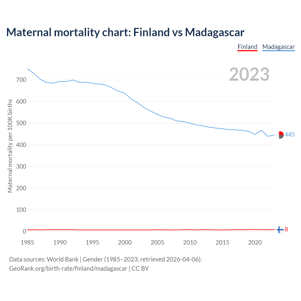 The maternal mortality rate, which is the probability of dying during childbirth or within 42 days of pregnancy termination, is 8 deaths per 100,000 live births in Finland, compared to 445 deaths in Madagascar.