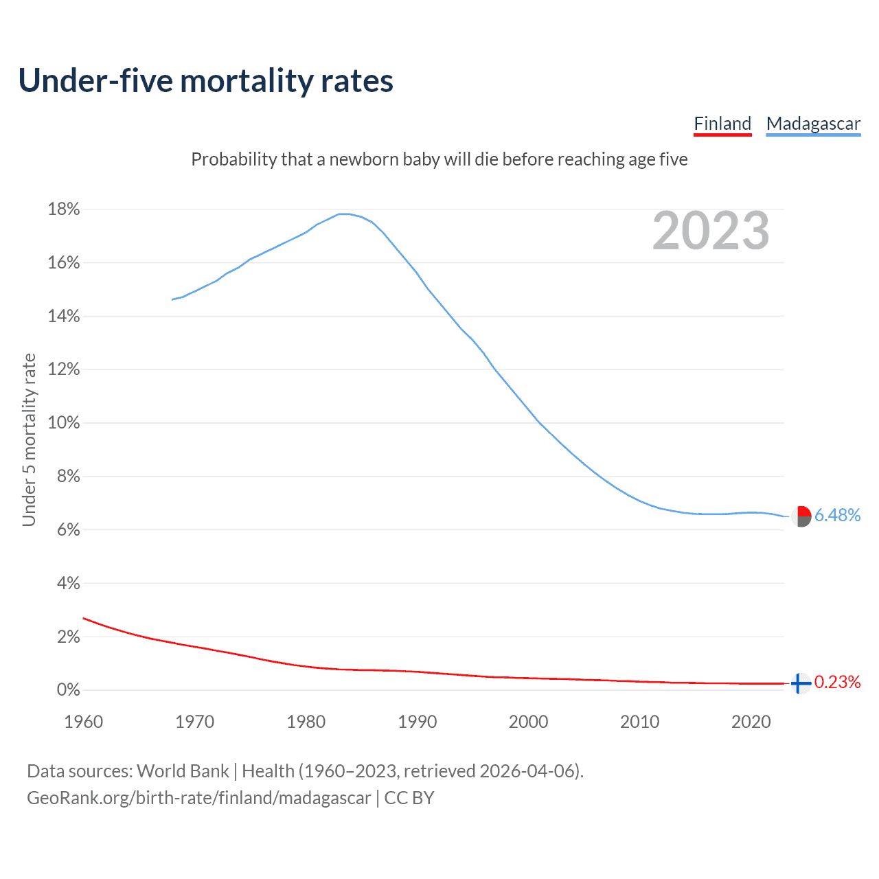 The chance that a newborn baby will die before reaching age five is 0.23% in Finland and 6.48% in Madagascar. Above is a chart with historical data on under-five mortality rates.