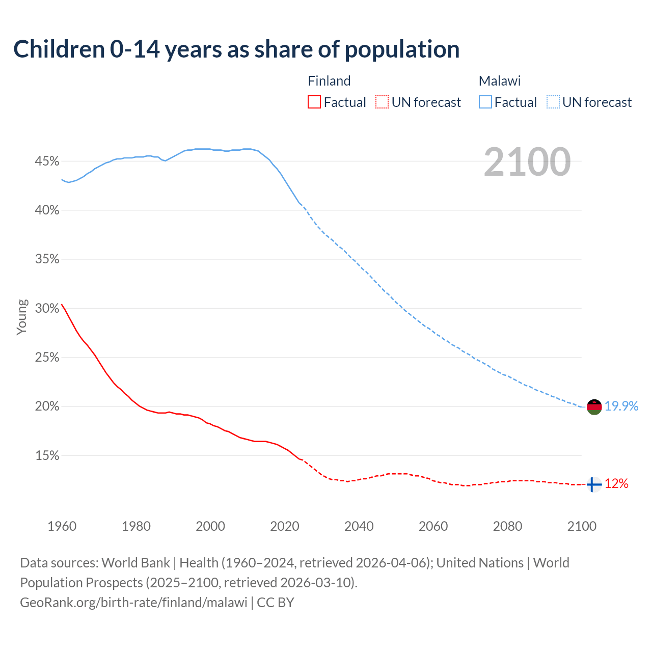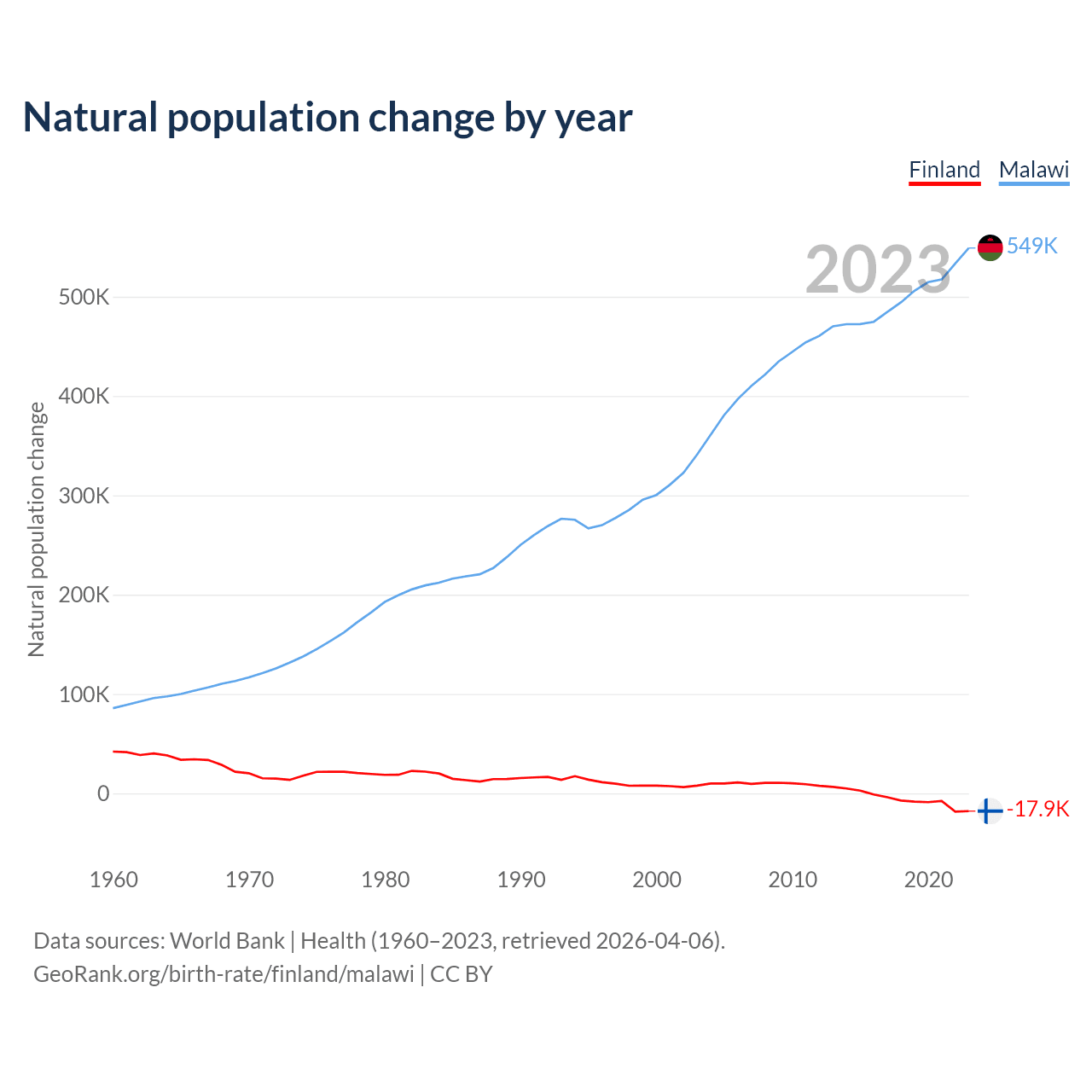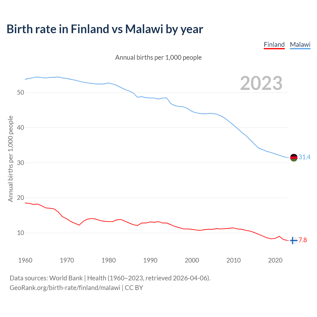 Finland has an annual birth rate of 7.8 births per 1,000 people, compared to 31.4 for Malawi. The average number of children a woman is expected to have during her lifetime — the fertility rate, is 1.26 in Finland and 3.65 in Malawi — 189.5% difference.
