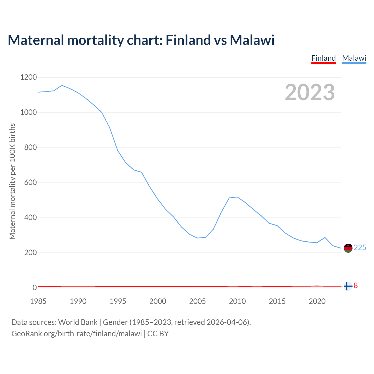 The maternal mortality rate, which is the probability of dying during childbirth or within 42 days of pregnancy termination, is 8 deaths per 100,000 live births in Finland, compared to 225 deaths in Malawi.