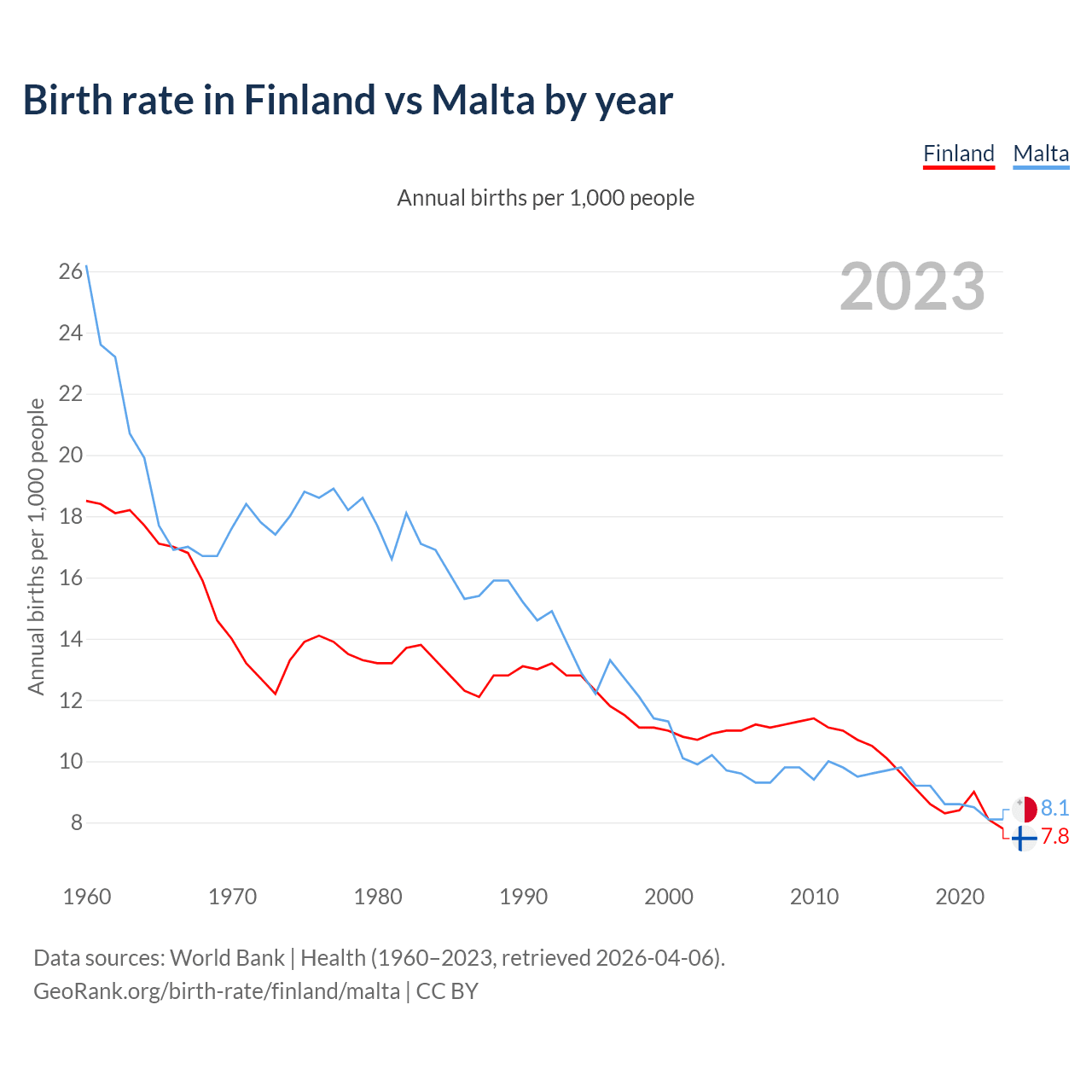 Finland has an annual birth rate of 7.8 births per 1,000 people, compared to 8.1 for Malta. The average number of children a woman is expected to have during her lifetime — the fertility rate, is 1.26 in Finland and 1.06 in Malta — 15.9% difference.