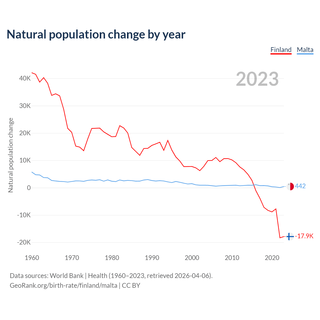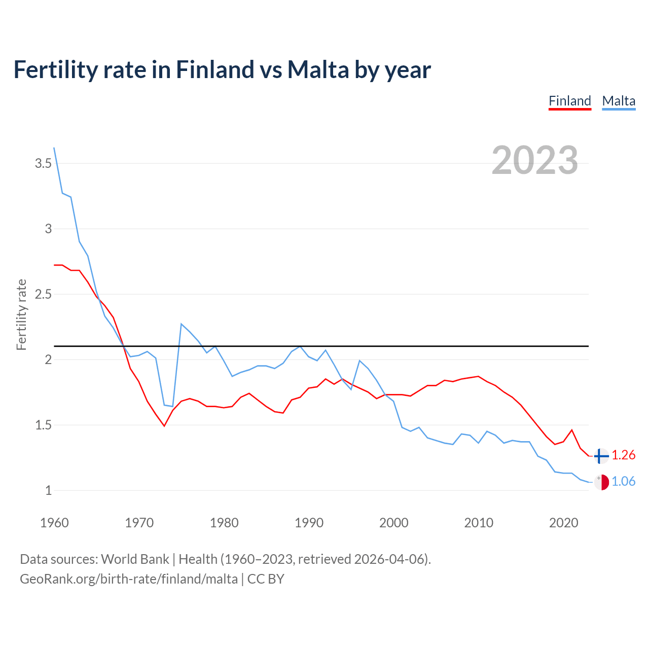 According to the latest available data on birth rates, the fertility rate in Finland was 1.26 children per woman in 2023, compared to 1.06 in Malta in 2023. The replacement level is considered to be 2.1 children per woman.