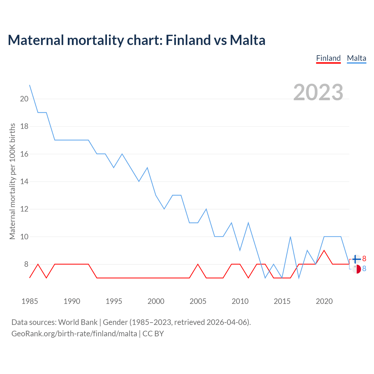 The maternal mortality rate, which is the probability of dying during childbirth or within 42 days of pregnancy termination, is 8 deaths per 100,000 live births in Finland, compared to 8 deaths in Malta.