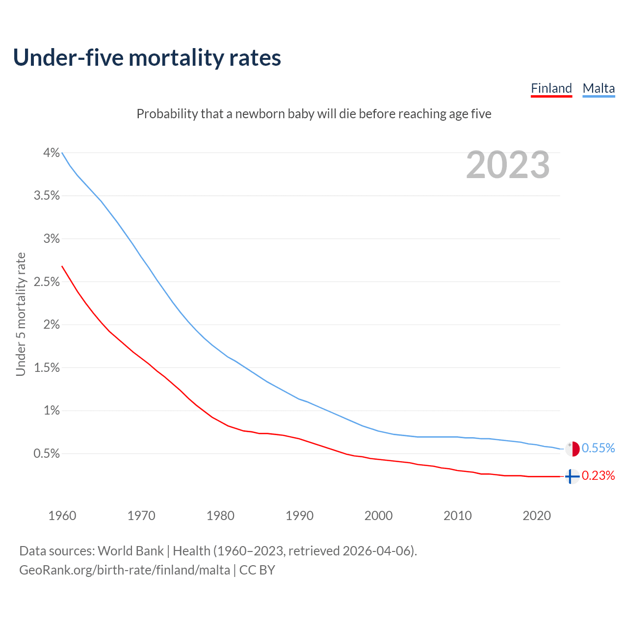 The chance that a newborn baby will die before reaching age five is 0.23% in Finland and 0.55% in Malta. Above is a chart with historical data on under-five mortality rates.
