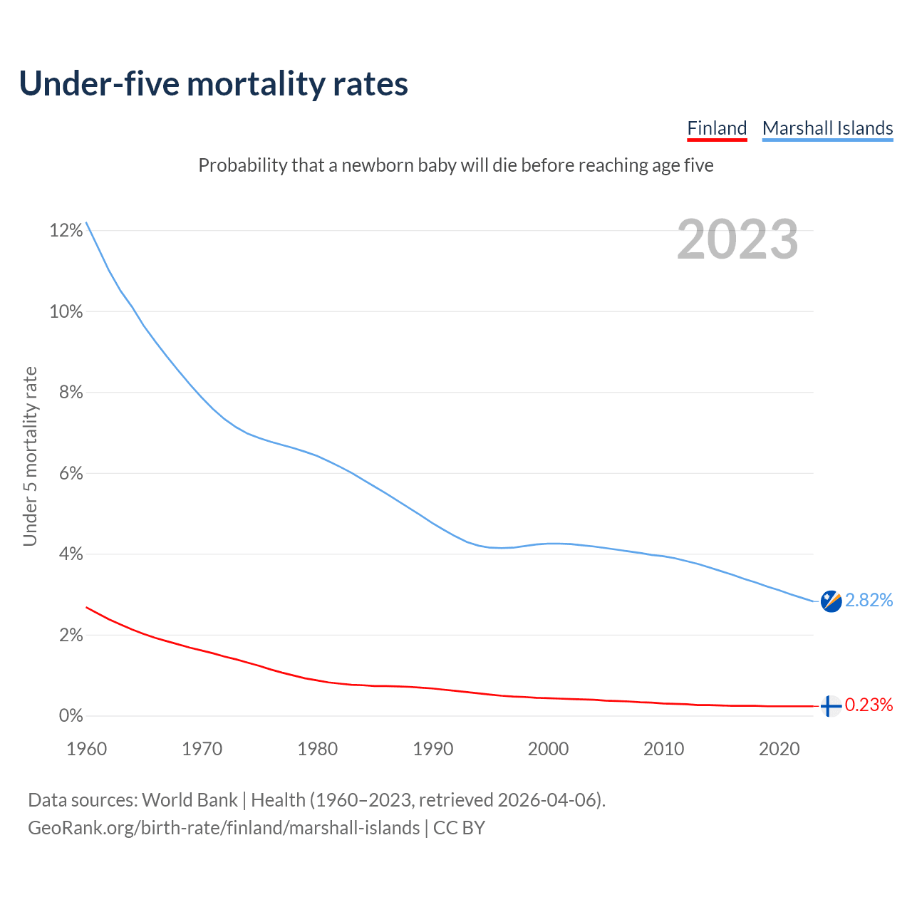 The chance that a newborn baby will die before reaching age five is 0.23% in Finland and 2.82% in the Marshall Islands. Above is a chart with historical data on under-five mortality rates.
