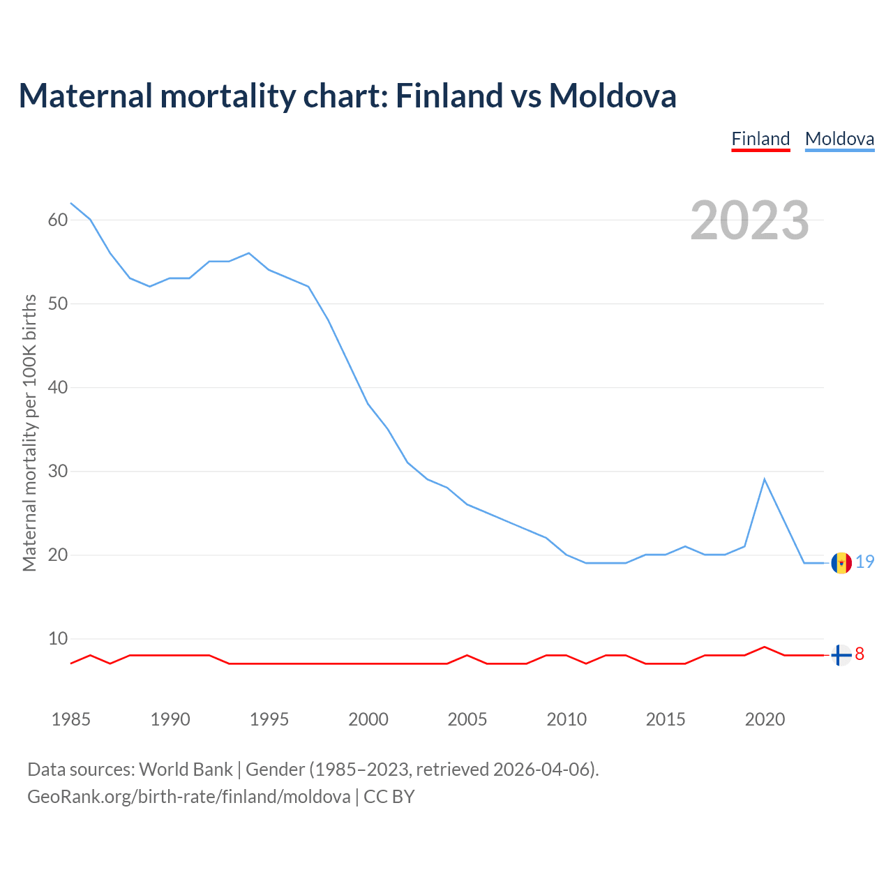 The maternal mortality rate, which is the probability of dying during childbirth or within 42 days of pregnancy termination, is 8 deaths per 100,000 live births in Finland, compared to 19 deaths in Moldova.